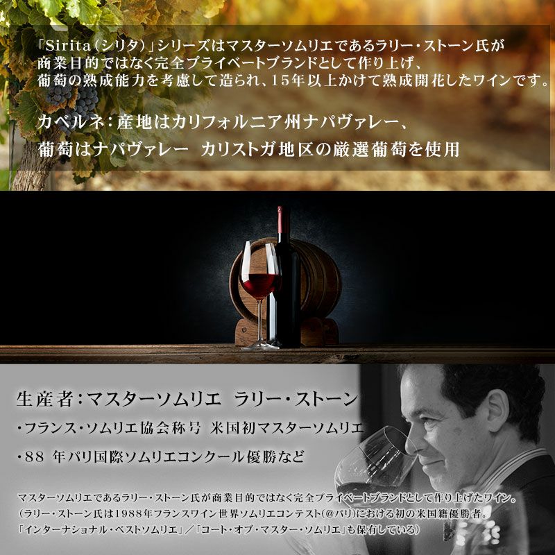 他の画像を見る 【VT:2003年】【当店の看板商品】ナパヴァレーのバックヴィンテージワイン 【古酒オープナー無料!2003年ヴィンテージ!】シリタ カベルネソーヴィニヨン 2003年 ヴィンテージワイン カリフォルニア ナパヴァレー ボルドー感 赤ワイン フルボディ ギフト・プレゼントにも★ おすすめ お肉料理におすすめ クール便選択可 通常価格 ¥ 9,802 のところ 当店特別価格 ¥ 8,820 税込 会員特別価格 ¥ 8,470 税込 在庫切れ 2003年ヴィンテージ!独特のレンガ色 スワリングした時の粘性 熟成開花のヴィンテージ。ギフトやプレゼントにも! 詳細を見る お気に入りに登録する