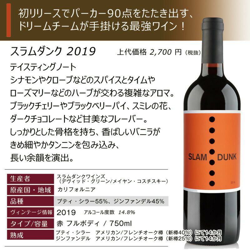 他の画像を見る ★JD91点 RP90点 スラム・ダンク 赤ワイン カリフォルニア 初リリースでパーカー90点をたたき出す、ドリームチームが手掛ける最強ワインスラムダンク 赤ワイン クール便選択可 通常価格 ¥ 2,730 のところ 当店特別価格 ¥ 2,650 税込 100点を獲得するライジングスター、メイヤン・コスチスキーと著名ワイナリーのコンサルタントを務めるデ ヴィッド・グリーンのドリームチームが手掛ける夢のようなワイン カートに入れる お気に入りに登録する