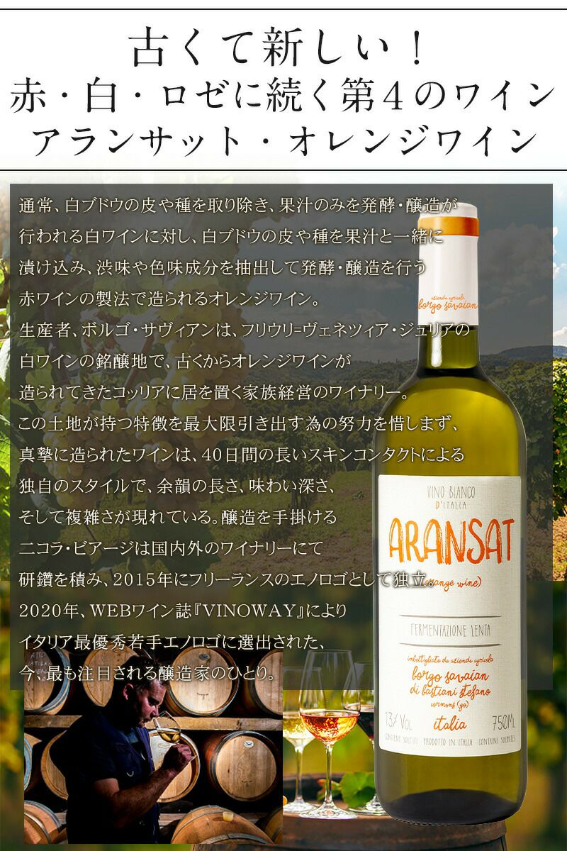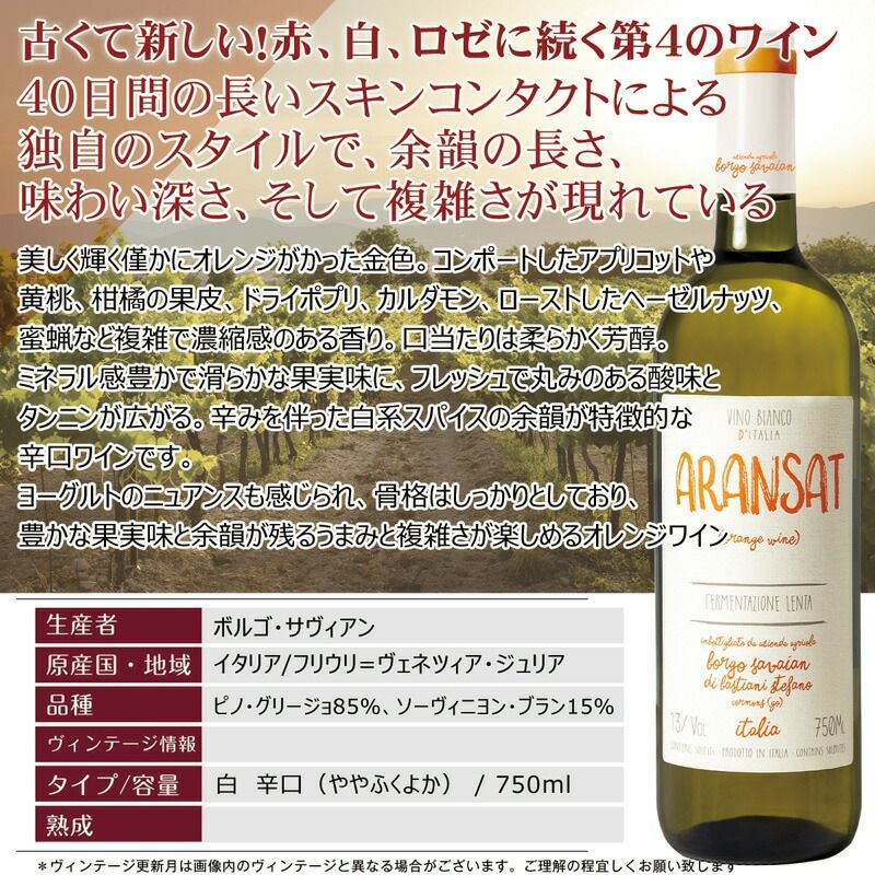 他の画像を見る 【旨人気オレンジワイン】 アランサット コスパ抜群のオレンジワイン 白ワインの銘醸地イタリア・フリウリ。40日間の長いスキンコンタクトによる独自スタイルで余韻の長さ、味わい深さ、そして複雑さが現れているワイン! 重め 辛口 クール便選択可 通常価格 ¥ 2,247 のところ 当店特別価格 ¥ 2,100 税込 イタリア・フリウリのオレンジワイン「アランサット」クセがなく、ピュアでクリアで飲みやすい!オレンジワイン初心者の方にもおすすめです! カートに入れる お気に入りに登録する