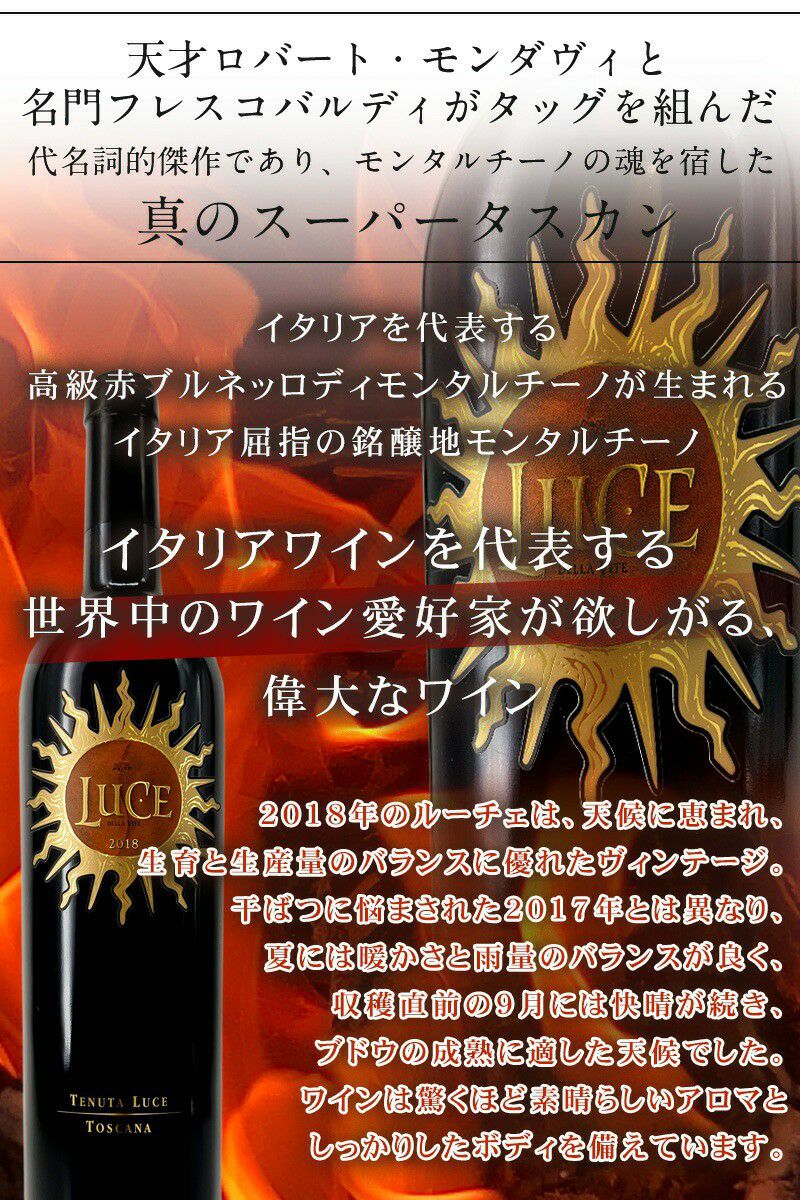 他の画像を見る 【お得な6本セット】ルーチェ 2018【クール便代無料】イタリアを代表する高級赤ブルネッロディモンタルチーノが生まれるイタリア屈指の銘醸地モンタルチーノの土地で造られるスーパートスカン「ルーチェ」2018年 重め 辛口 クール便選択可 当店特別価格 ¥ 100,000 税込 在庫切れ ワイナリーの象徴でもあるフラッグシップキュヴェ。モンタルチーノの畑の中でも最も状態の良いサンジョヴェーゼとメルロが毎年50%ずつブレンドして造られます 詳細を見る お気に入りに登録する