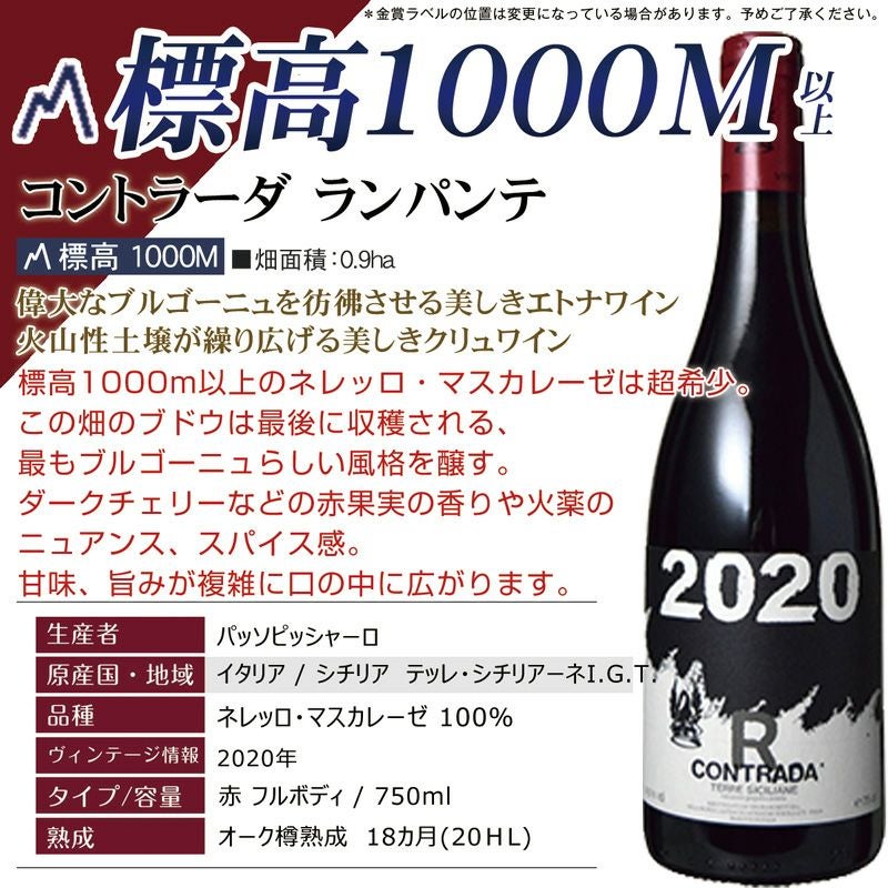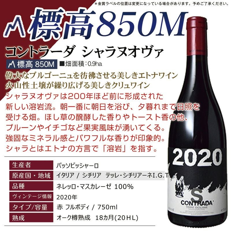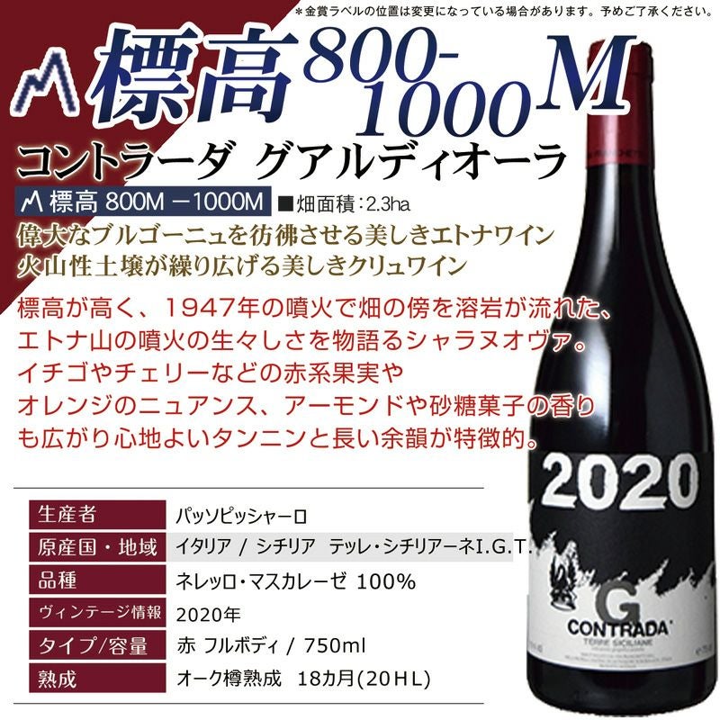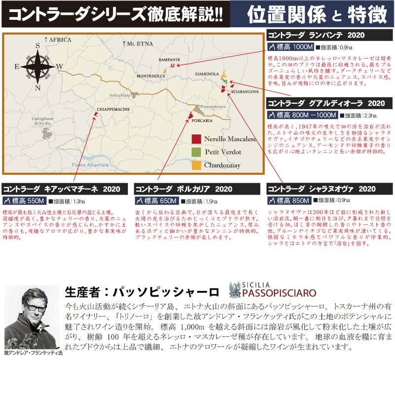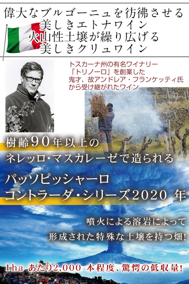 他の画像を見る 樹齢90 年以上【標高違いセット!】 【標高違いセット!】樹齢90 年以上のネレッロ・マスカレーゼで造られる【パッソピッシャーロ コントラーダ・シリーズ2020年】トスカーナ州の有名ワイナリー「トリノーロ」を創業した故アンドレア・フランケッティ氏のワイン New! おすすめ 重め 辛口 クール便選択可 通常価格 ¥ 68,000 のところ 当店特別価格 ¥ 64,900 税込 偉大なブルゴーニュを彷彿させる美しきエトナワイン火山性土壌が繰り広げる美しきクリュワイン。ネレッロ・マスカレーゼ 100%で作られるコントラーダ カートに入れる お気に入りに登録する
