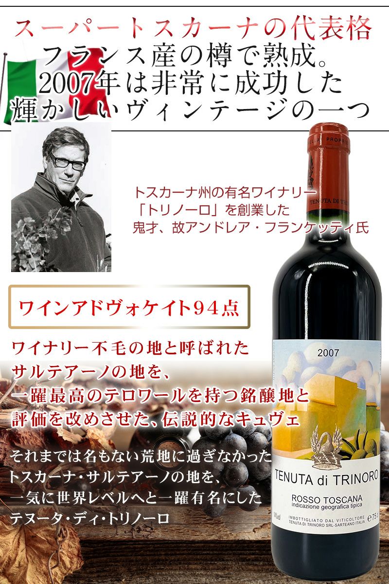 他の画像を見る ワイナリー不毛の地だったサルテアーノの地を一躍最高のテロワールを持つ銘醸地と評価を改めさせた伝説的キュヴェ 【トリノーロ 2007】鬼才、故アンドレア・フランケッティ氏のワイン 毎年そのビンテージのベストな比率を模索しトリノーロスタイルに仕上げる。それまで名もない荒地に過ぎなかったトスカーナサルテアーノの地を一気に世界レベルへ一躍有名にしたテヌータ・ディ・トリノーロ New! おすすめ 重め 辛口 クール便選択可 通常価格 ¥ 29,900 のところ 当店特別価格 ¥ 28,990 税込 鬼才、故アンドレア・フランケッティ氏のワイン。ワイナリー不毛の地だったサルテアーノの地を一躍最高のテロワールを持つ銘醸地と評価を改めさせた伝説的キュヴェ カートに入れる お気に入りに登録する