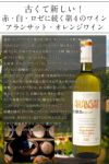 通常、白ブドウの皮や種を取り除き、果汁のみを発酵・醸造が行われる白ワインに対し、白ブドウの皮や種を果汁と一緒に漬け込み、渋味や色味成分を抽出して発酵・醸造を行う赤ワインの製法で造られるオレンジワイン。