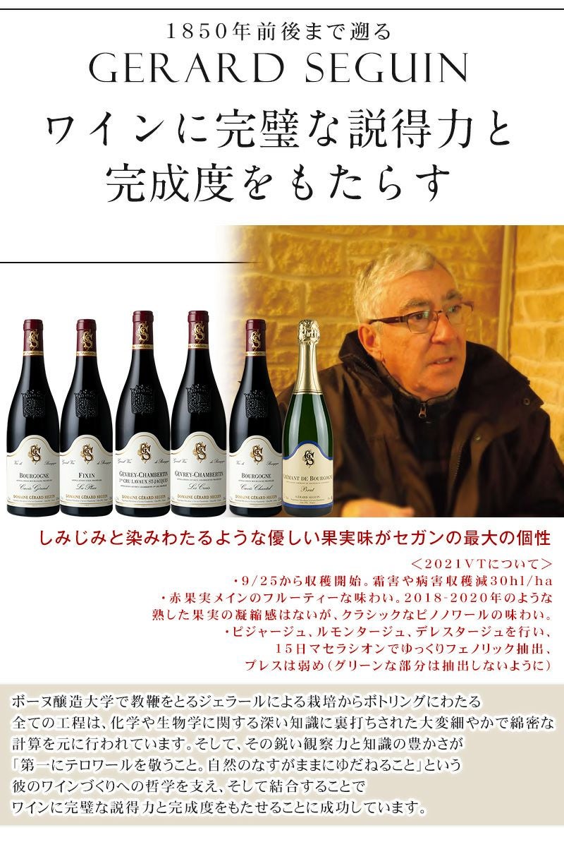 他の画像を見る ジュヴレ・シャンベルタン村の斜面上方に位置した畑ラヴォー・サン・ジャック。トロンセ産の新樽率50%で18ヶ月熟成。シルキーな口当たり、調和のとれたエレガントなワイン! 【お勧めドメーヌ! ブルゴーニュ 】ジェラールセガン ジュヴレ シャンベルタン プルミエクリュ ラヴォー サン ジャック 2021 平均樹齢約70年 ジュヴレの9つの特級畑に次ぐ、10番目の特級に匹敵するとの評判の区画 ブルゴーニュ ピノノワール★ New! おすすめ 重め 辛口 クール便選択可 当店特別価格 ¥ 15,900 税込 1850年からの礎。第一にテロワールを敬い自然のなすがままに委ねるという彼らのワイン造りへの哲学の完成品! 力強さだけでなく繊細で複雑な余韻が楽しめる超逸品! カートに入れる お気に入りに登録する