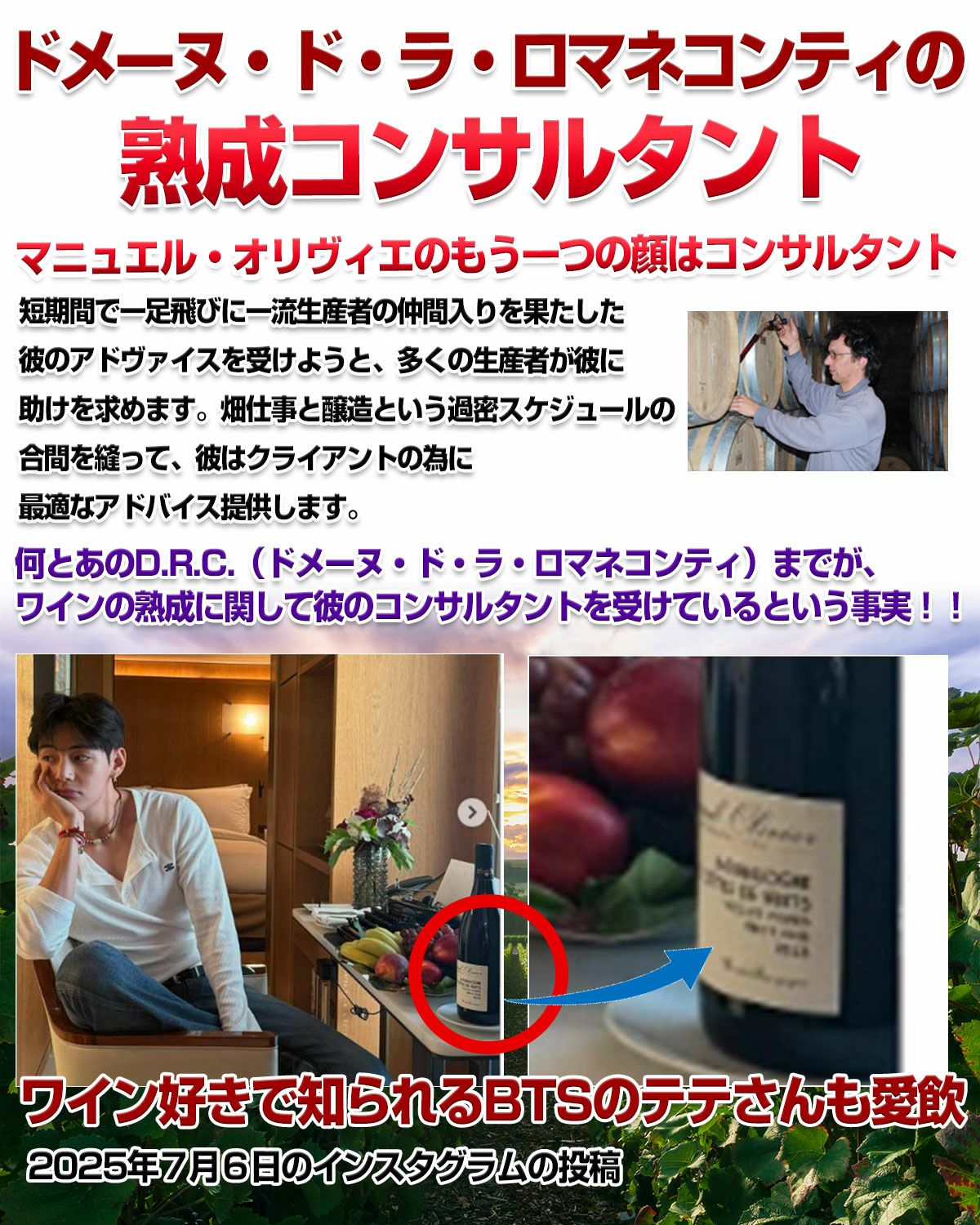 他の画像を見る BTSのテテさんも愛飲(インスタグラムより) DRCのコンサルを務めたブルゴーニュの新星が放つ至極のピノ BTSのテテさんも愛飲(インスタグラムより)【オート・コート・ド・ニュイ・ルージュ・ヴィエイユ・ヴィーニュ ドメーヌ・マニュエル・オリヴィエ】フランス ブルゴーニュ 赤ワイン ミディアムボディ 750ml New! 重め 軽め 辛口 当店特別価格 ¥ 5,980 税込 カートに入れる お気に入りに登録する