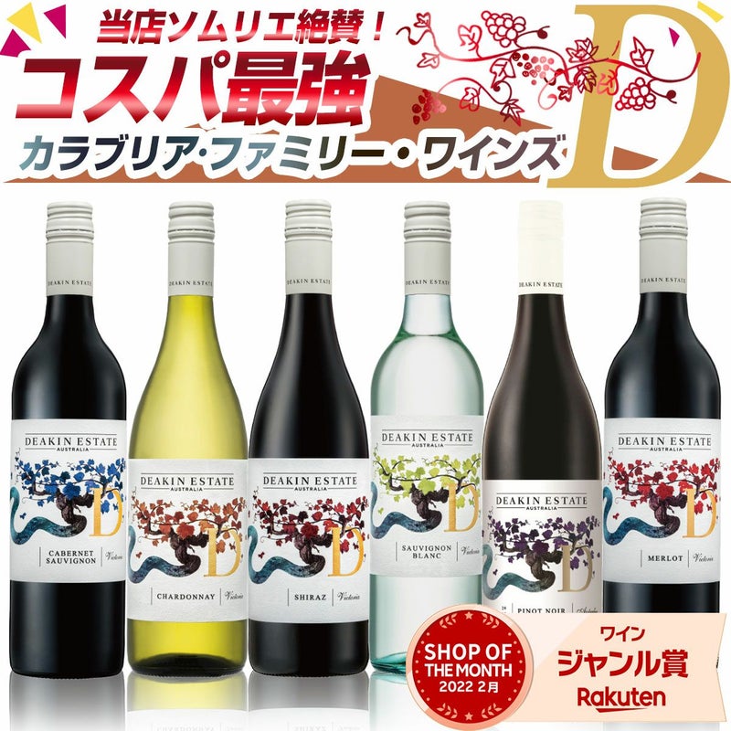 教科書的な味わいで、ソムリエ試験の二次対策でもよく使用されるディーキン・エステート。カベルネ、シャルドネ、ソーヴィニヨンブラン、ピノ、シラーズ、メルローのお得6本セット!