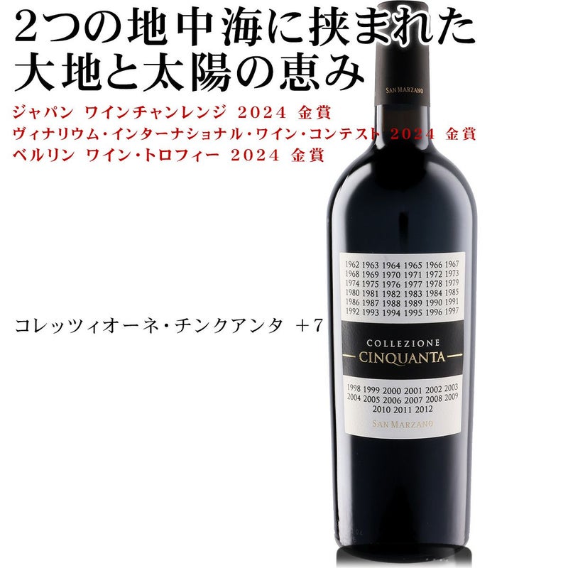 コレッツィオーネ・チンクアンタ。生産者であるサン・マルツァーノ社が創業50周年を記念しリリースした特別な赤ワインです。ラベルには創業からリリースに至るまでの歴史を刻むかのように、全ての年号がデザインされています。