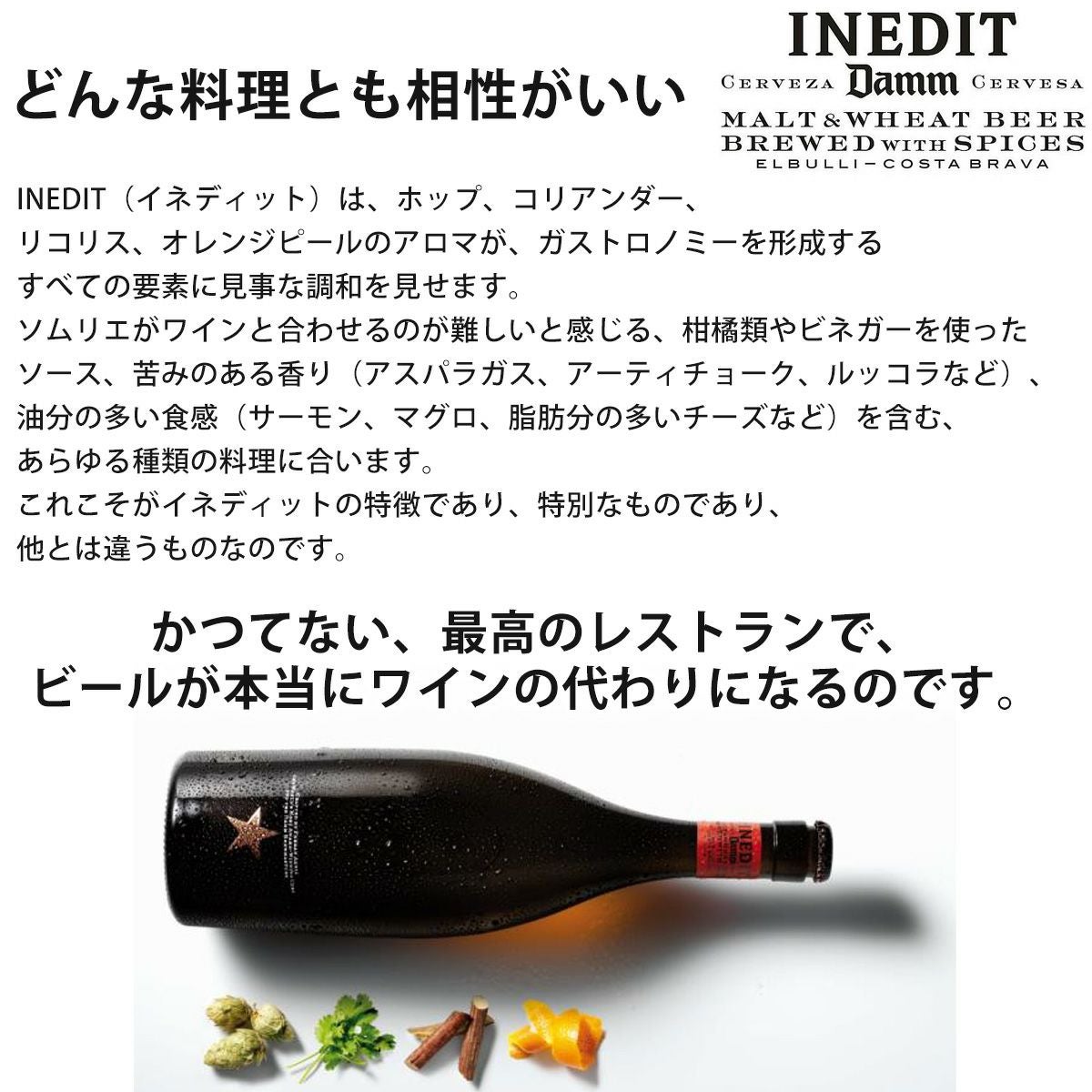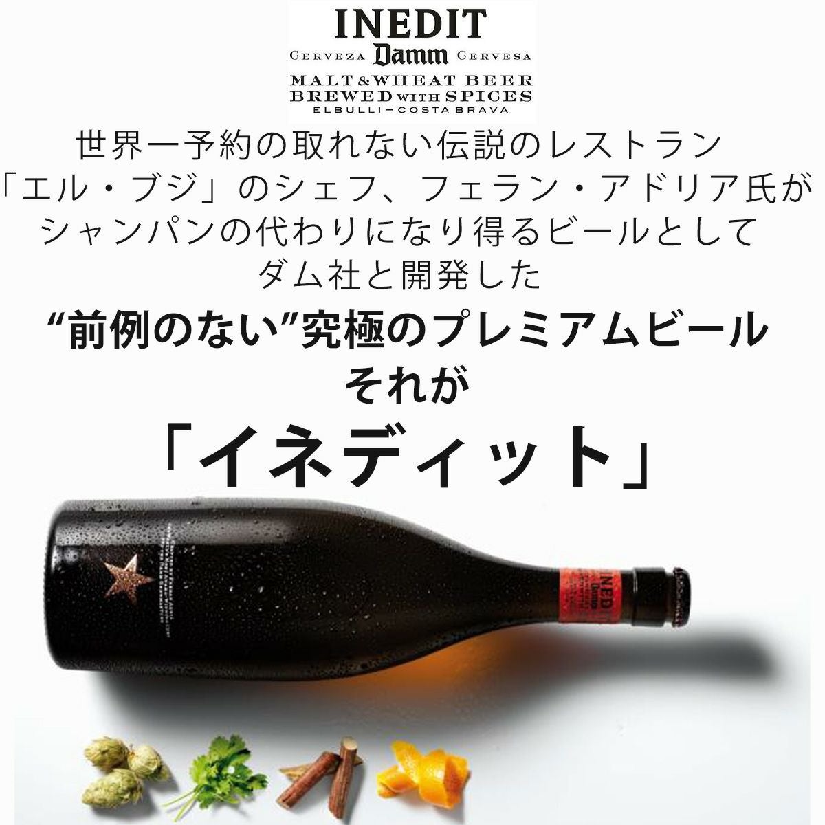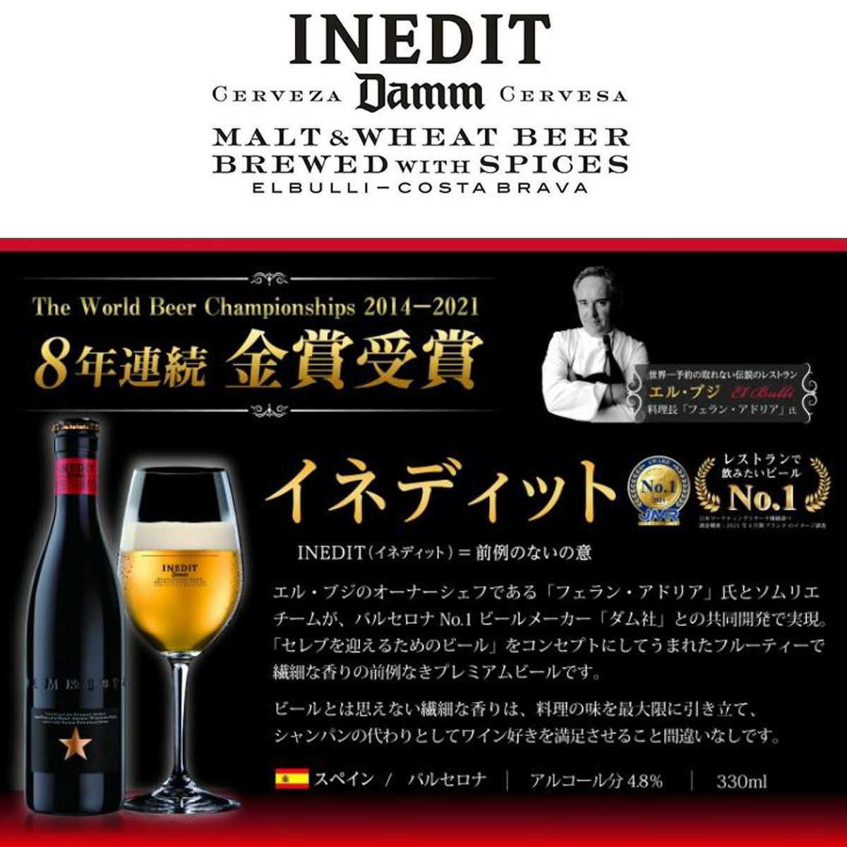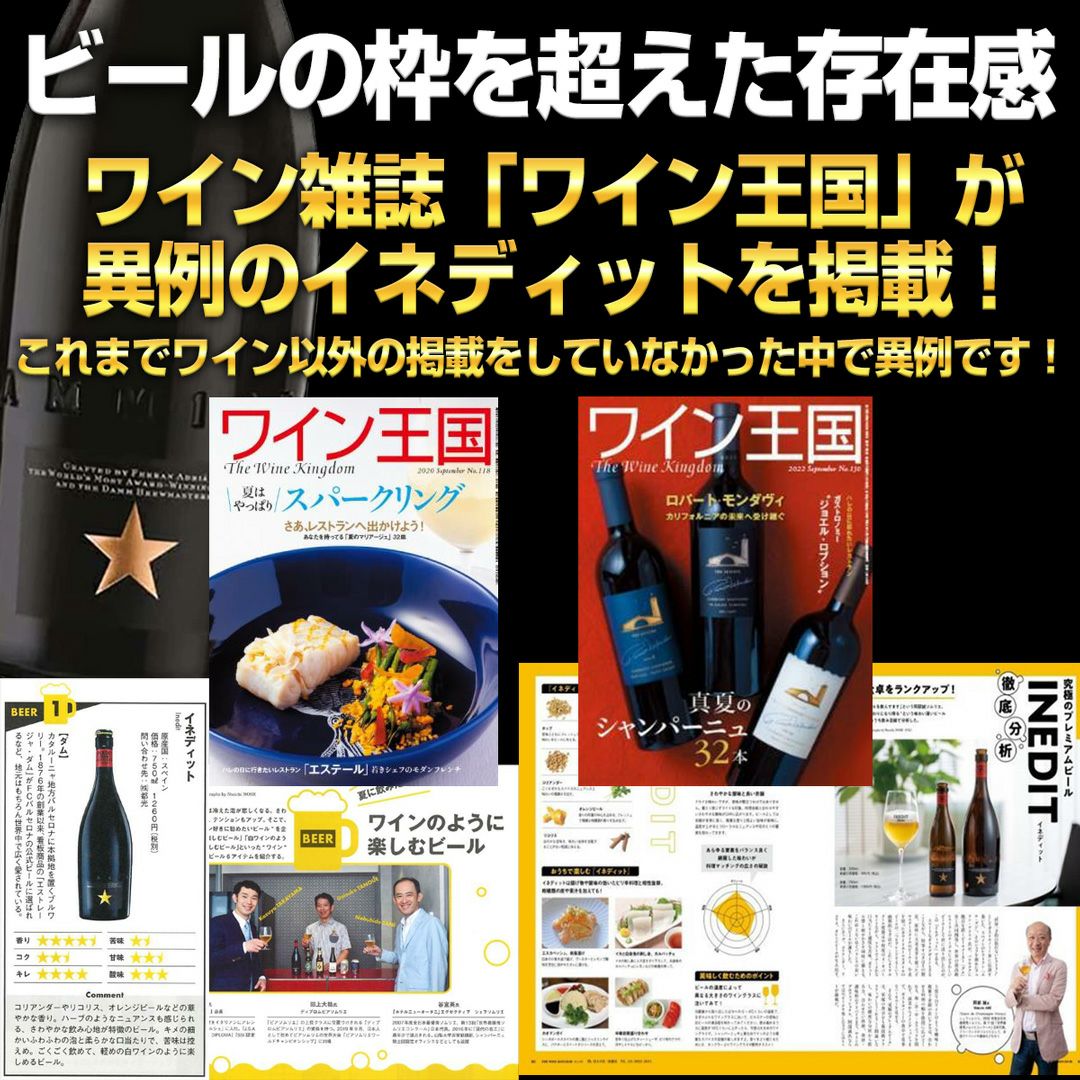 他の画像を見る World Beer Championships 8年連続金賞受賞 (2014-2021) をはじめ世界的レストラン品評会ASIA 50 BESTの公式スポンサービールを務めるビールの枠を超えた究極のプレミアムビール! お中元 ビール ギフト 夏ギフト 究極のプレミアムビール「 イネディット 750ml 」 世界一予約の取れない伝説のレストラン「エル・ブジ」のシェフ、フェラン・アドリア氏がシャンパンの代わりになり得るビールとしてダム社と開発した“前例のない”究極のプレミアムビール! コスパ◎ New! クール便選択可 当店特別価格 ¥ 2,775 税込 カートに入れる お気に入りに登録する