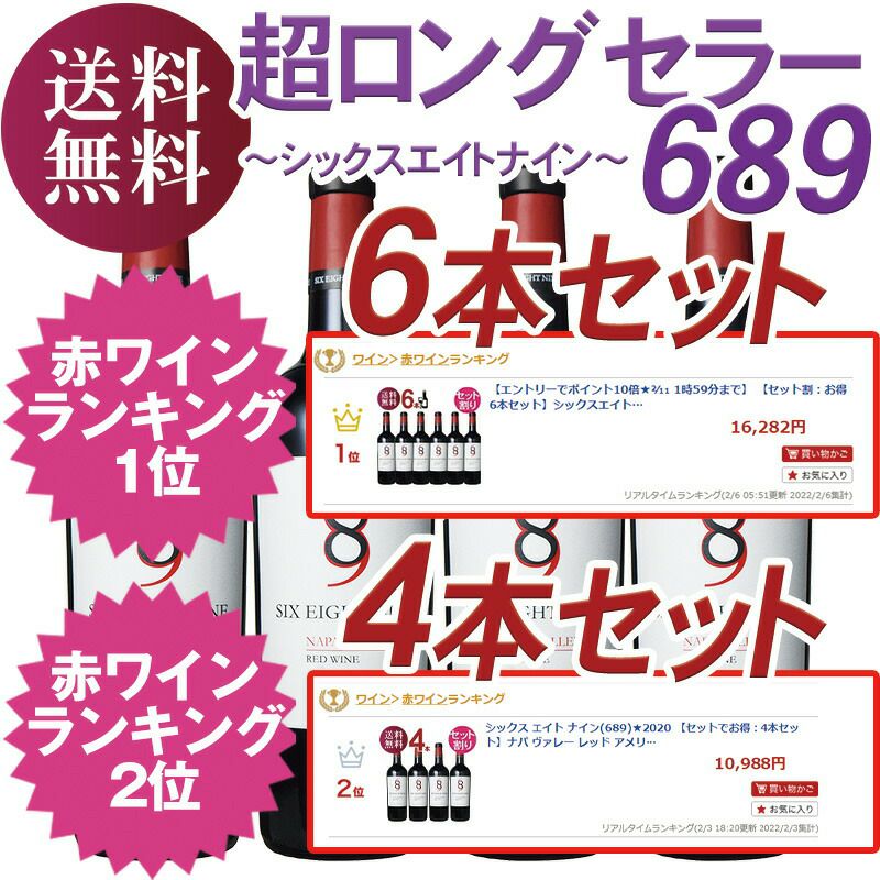 他の画像を見る 【ロングセラー カリフォルニアナパヴァレー689!】 赤ワイン 689【セット割:お得6本セット】シックスエイトナイン”レッド” ★2021 ナパヴァレー Six Eight Nine 689 カリフォルニア ワイン ナパ 赤ワイン セット おすすめ 重め 辛口 クール便選択可 通常価格 ¥ 18,974 のところ 当店特別価格 ¥ 18,874 税込 ナパヴァレーのテロワールを感じるソフトで甘いタンニンとスモークしたスパイス香を持つ魅力的なセクシーなフィニッシュが特徴"超得"を使うと更にお得! カートに入れる お気に入りに登録する