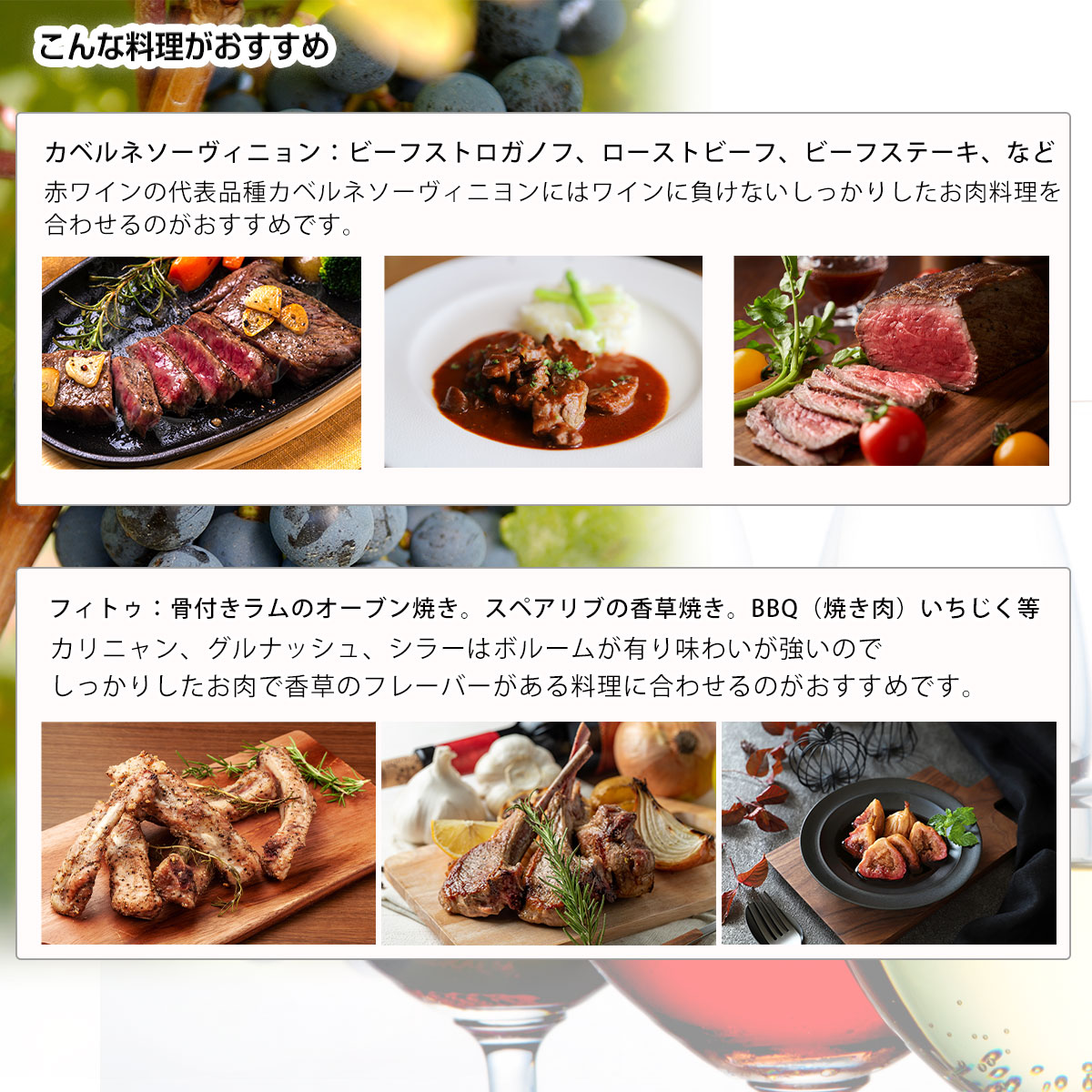 ブレンドされたワインは、ミディアムからフルボディの力強いスタイルが多く、ジビエを使ったパテやリエット、しっかりとした味付けの肉料理と相性が良いとされています。