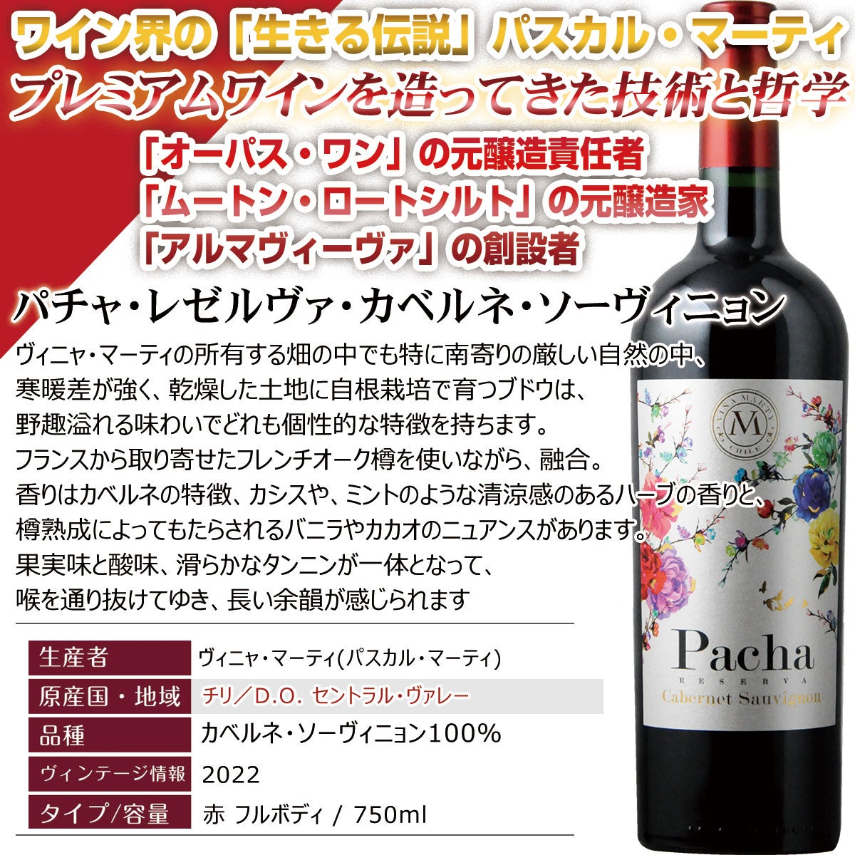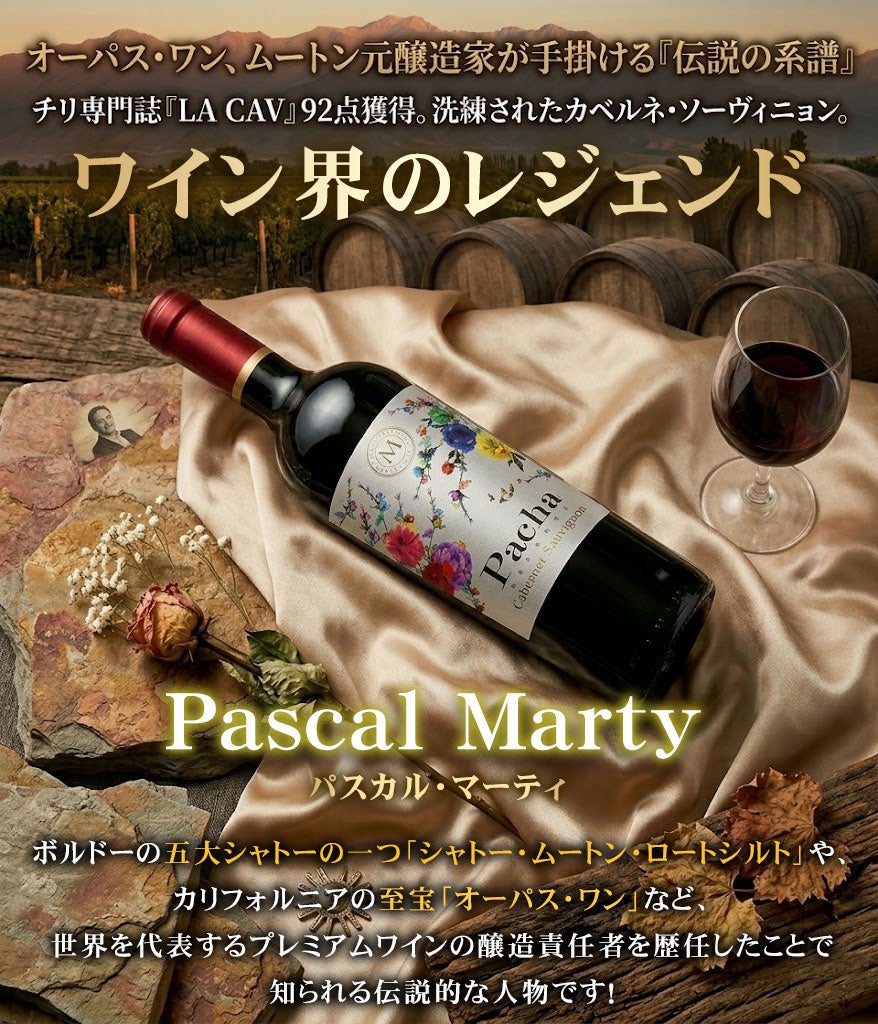 木箱付き ワインギフト 五大シャトーの1つ、「ムートン・ロートシルト」の元ワインメーカーでありカリフォルニアの高級カルトワイン「オーパス・ワン」とチリの最高峰「アルマヴィーヴァ」の創設者パスカルマーティ氏のワイン【パチャ・レゼルヴァ・カベルネソーヴィニョン】