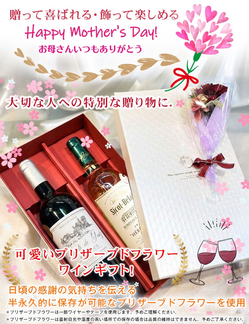 他の画像を見る 母の日ギフト ワインギフト お花付き お誕生日 母の日 贈り物 プリザーブドフラワー ミニブーケ付き 赤ワイン 白ワイン | 送料無料 「アンジェリュス」「スミス・オー・ラフィット」出身のジェローム氏の赤ワイン 5大シャトーのオーブリオン元醸造家が造るフレデリックベロ氏の白ワイン New! おすすめ 特別セール 重め 辛口 クール便選択可 通常価格 ¥ 5,500 のところ 当店特別価格 ¥ 3,980 税込 【プリザーブドフラワー付き!】母の日“お得な”お花とワインの“W”ギフト! カートに入れる お気に入りに登録する