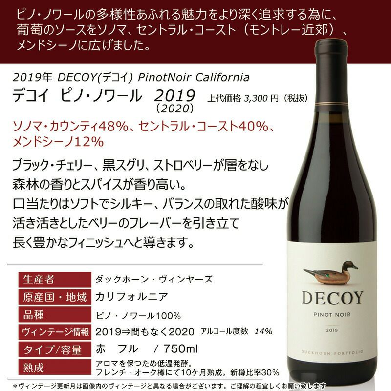 他の画像を見る 【おすすめ】ダックホーン デコイ ピノノワール カリフォルニア ワイン アロマを保つため低温発酵。フレンチ・オーク樽にて10ケ月熟成。新樽比率30% 重め 辛口 クール便選択可 通常価格 ¥ 2,830 のところ 当店特別価格 ¥ 2,790 税込 ピノノワールの多様性溢れる魅力を深く追求する為に、葡萄のソースをソノマ、セントラルコースト、メンドシーノに広げました。リリースから贅沢な味わいを楽しめるピノノワールです カートに入れる お気に入りに登録する