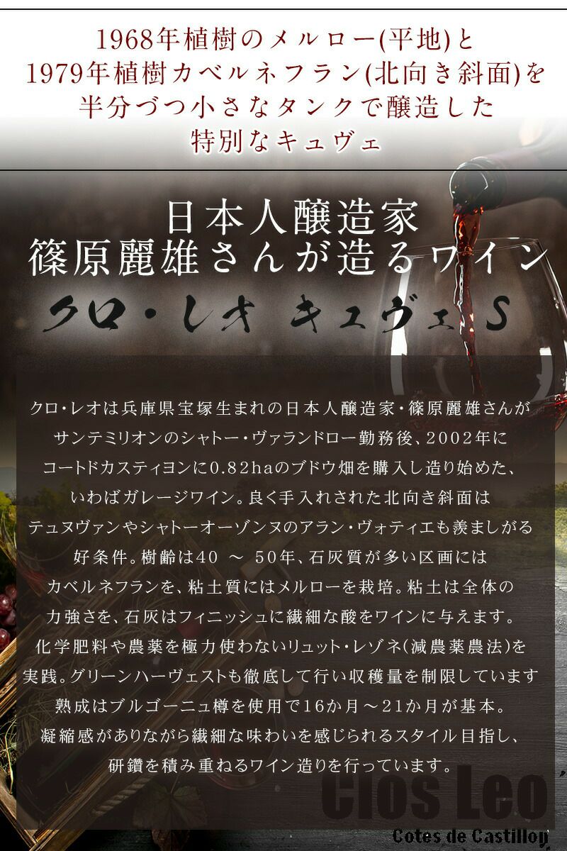 他の画像を見る 【生産量480本の希少品!日本人醸造家、篠原麗雄氏が造るボルドー】【クロ レオ キュヴェ S 2020】Clos Leoに比べると骨格がしっかりしておりメルローの柔らかさとカベルネフランの凛とした味わいが印象的 重め 辛口 クール便選択可 通常価格 ¥ 21,740 のところ 当店特別価格 ¥ 21,740 税込 1968年植樹のメルロー(平地)と1979年植樹カベルネ・フラン(北向き斜面)を半分づつ小さなタンクで醸造した特別なキュヴェ カートに入れる お気に入りに登録する