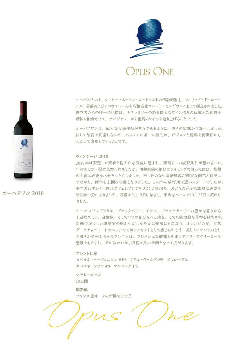 他の画像を見る 【超得でシリタも1本付いてくる!】オーパス・ワン2018 赤ワイン 伝統と革新の融合 恵まれた19年ヴィンテージ 重め 辛口 クール便選択可 当店特別価格 ¥ 79,800 税込 在庫切れ シャトー・ムートン・ロートシルトの伝説的当主フィリップ・ド・ロートシルト男爵とナパヴァレーの有名醸造家ロバート・モンダヴィによって生み出された至高のワイン 詳細を見る お気に入りに登録する