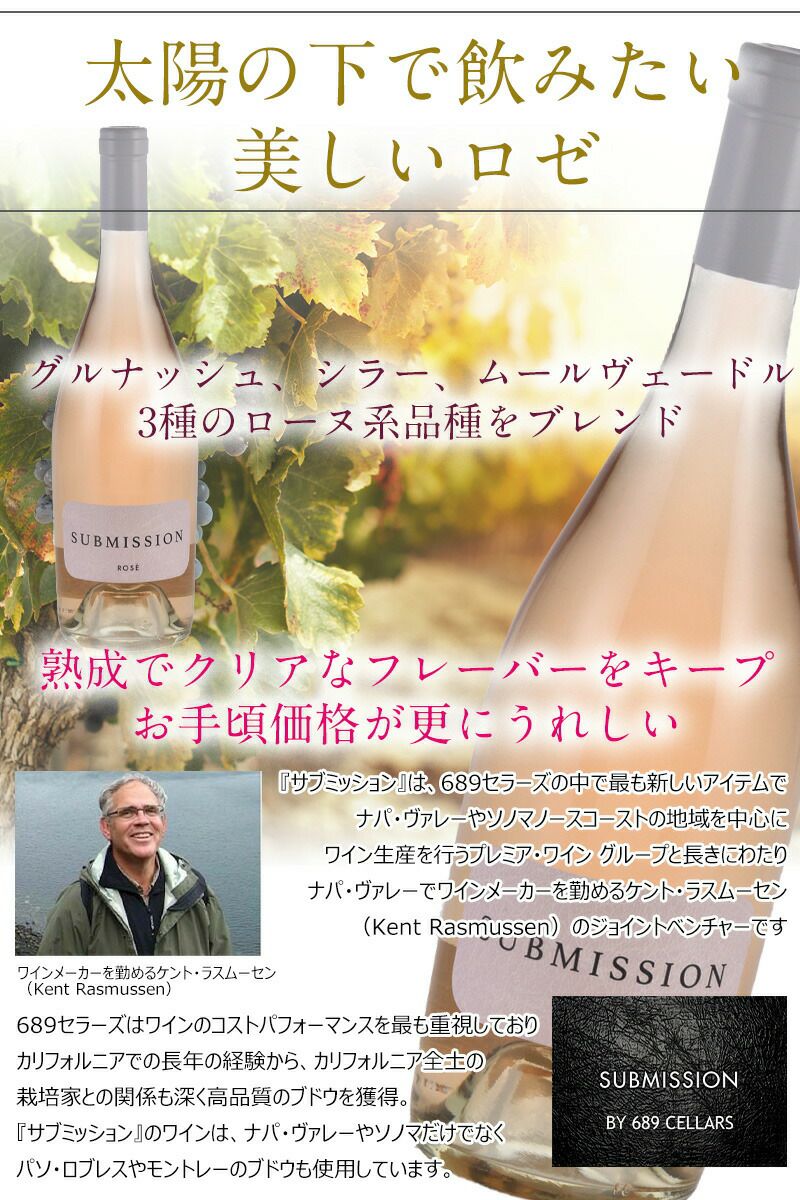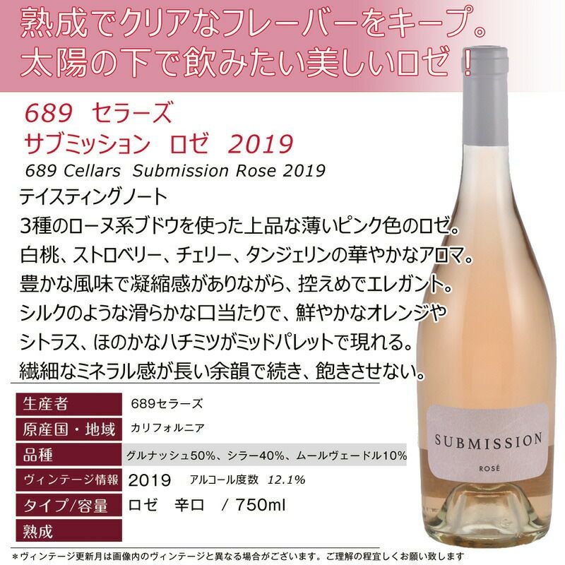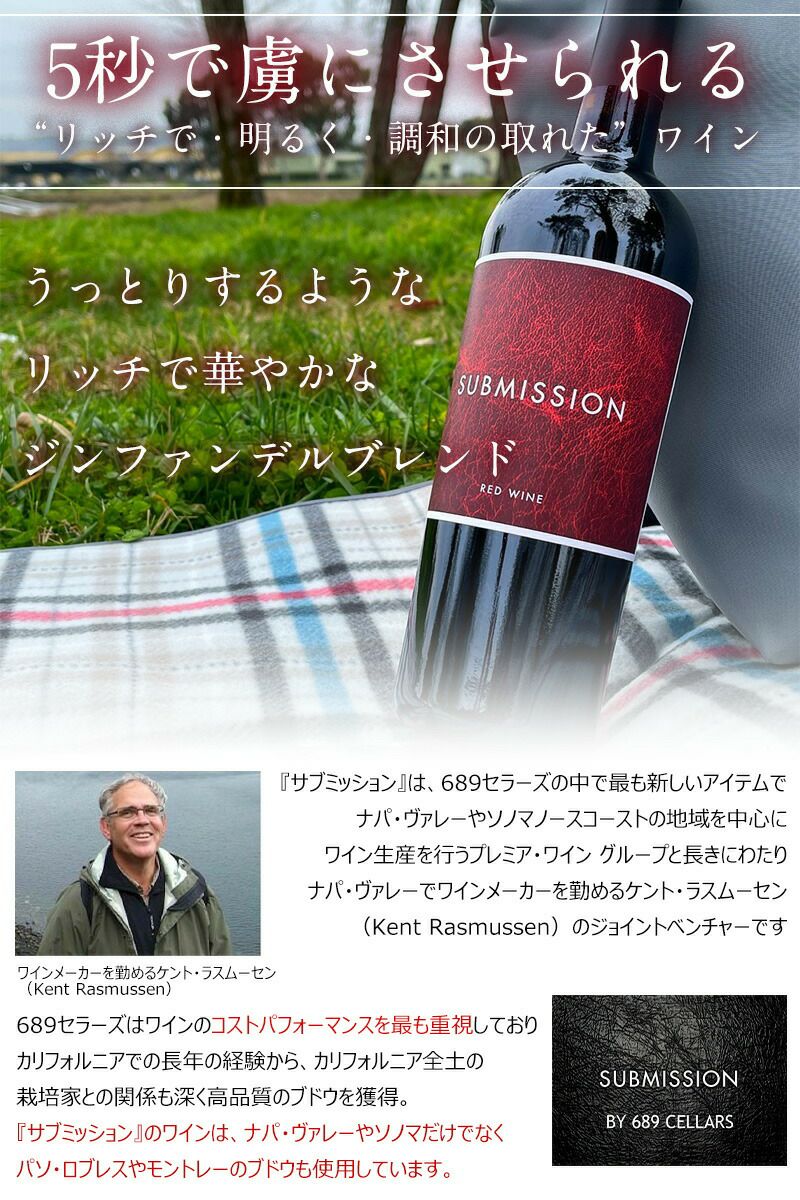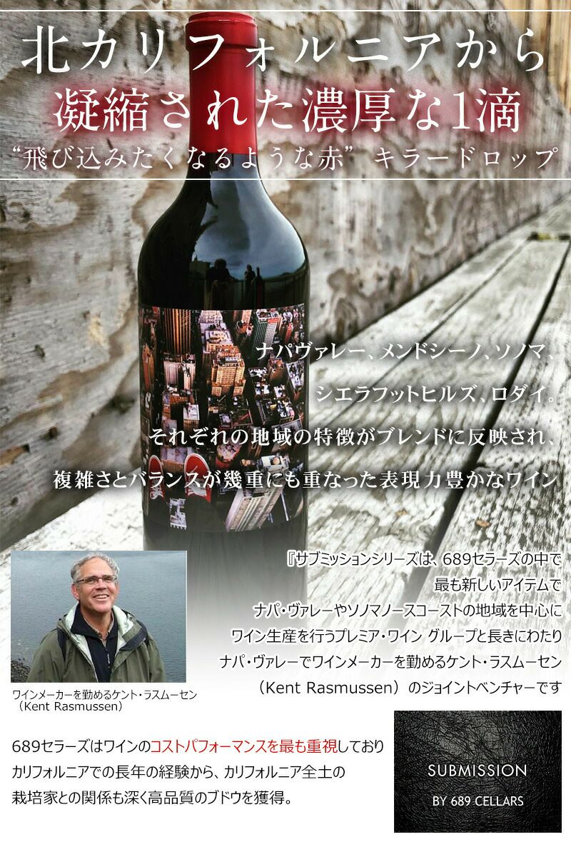 他の画像を見る 【お得な4本セット】1本あたりお得に!シックスエイトナインセラーズ サブミッション “レッド” 689セラーズ カリフォルニアワイン 赤ワイン フルボディ セットでお得! 重め 辛口 クール便選択可 通常価格 ¥ 9,968 のところ 当店特別価格 ¥ 9,882 税込 うっとりするようなリッチで華やかなジンファンデルブレンド! ふくよかな赤い果実と柔らかい樽のニュアンスがパーフェクトバランス カートに入れる お気に入りに登録する