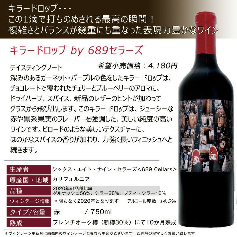 他の画像を見る 689セラーズ キラードロップ シックスエイトナインセラーズ “キラードロップ” 1滴で心奪われる KILLER DROP by 689 カリフォルニアワイン 赤ワイン フルボディ セットなら更にお得! おすすめ 重め 辛口 クール便選択可 通常価格 ¥ 3,928 のところ 当店特別価格 ¥ 3,890 税込 北カリフォルニアから"凝縮された濃厚な1滴"飛び込みたくなる赤-1滴で心奪われるキラードロップ! カートに入れる お気に入りに登録する