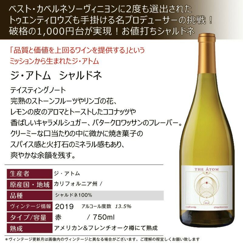 他の画像を見る 【おすすめ!1,000円台シャルドネ】ジ・アトム シャルドネ ベストワインアワードで"2度"もベストカベルネに選出されたトゥエンティロウズの名プロデューサーの挑戦! カリフォルニア白ワイン 辛口 重め 辛口 クール便選択可 通常価格 ¥ 1,960 のところ 当店特別価格 ¥ 1,880 税込 「品質と価値を上回るワインを提供する」というミッションから生まれたジ・アトム 驚きの1,000円台! カートに入れる お気に入りに登録する