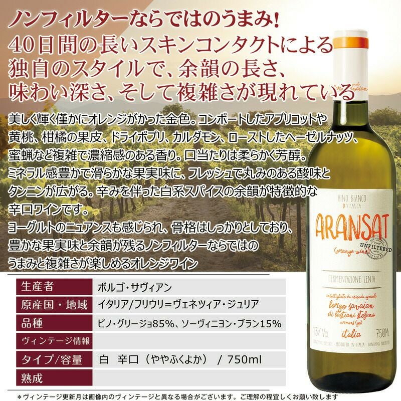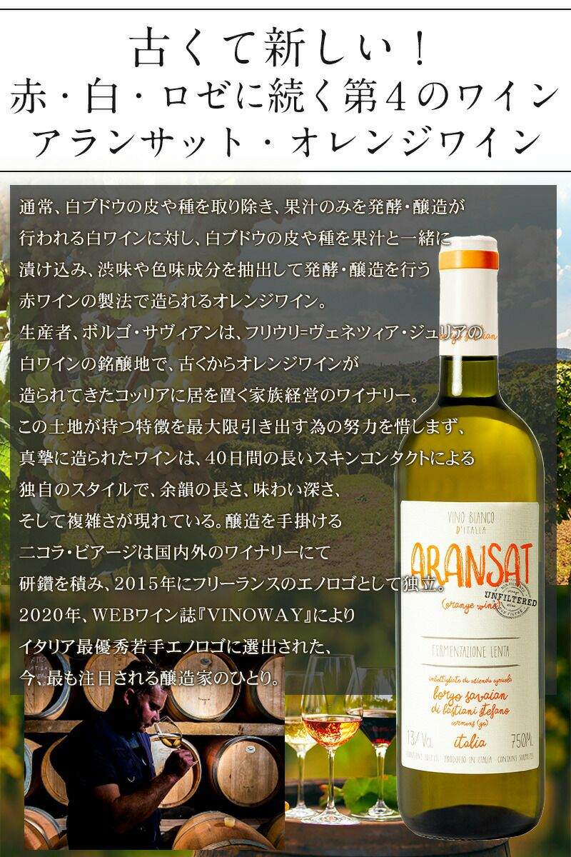 他の画像を見る おすすめ♪ノンフィルターオレンジワン!【コスパ抜群の旨人気オレンジワイン】【ノンフィルター】アランサット4本セット! 白ワインの銘醸地イタリア・フリウリ。40日間の長いスキンコンタクトの独自スタイルで余韻、味わい深さ、そして複雑さが現れているワイン おすすめ 重め 辛口 クール便選択可 通常価格 ¥ 7,880 のところ 当店特別価格 ¥ 7,450 税込 イタリア・フリウリのオレンジワイン「アランサット」クセがなく、ピュアでクリアで飲みやすい!オレンジワイン初心者の方にもおすすめです! カートに入れる お気に入りに登録する