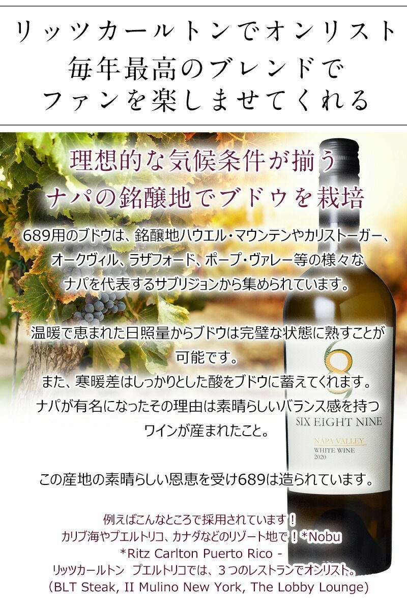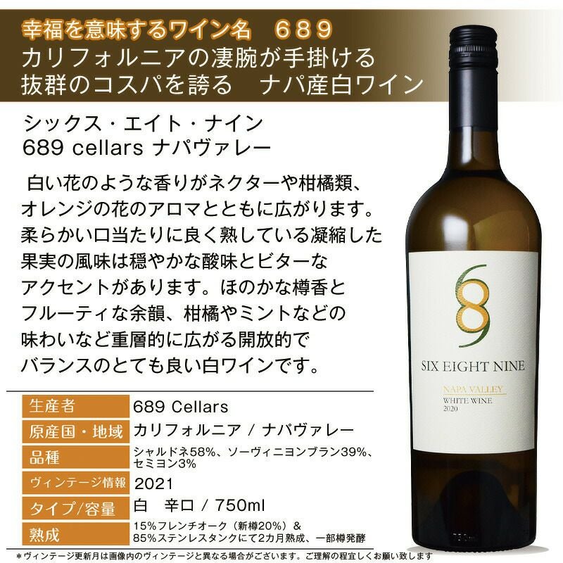 他の画像を見る 白ワイン シックス エイト ナイン ”ホワイト” ナパヴァレー Six Eight Nine White Wine 689 カリフォルニアワイン ナパバレー ナパ 白ワイン【ギフト】 重め 辛口 クール便選択可 通常価格 ¥ 3,099 のところ 当店特別価格 ¥ 2,999 税込 白い花のような香りがネクターや柑橘類、オレンジの花のアロマとともに広がります。とてもバランスの良い白ワインです カートに入れる お気に入りに登録する