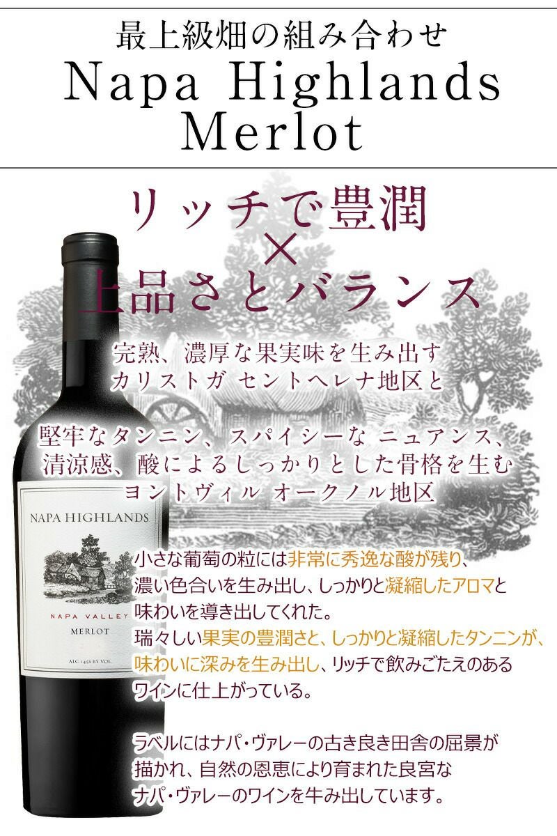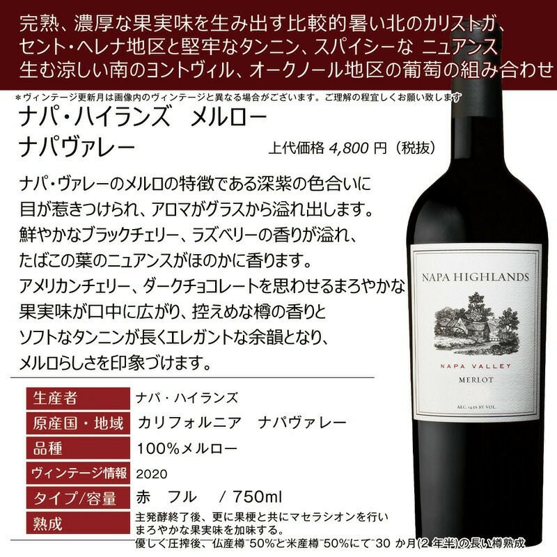 他の画像を見る 【お得な4本セット凝縮メルロー★2020】ナパハイランズ・メルロー ナパヴァレーの葡萄栽培農家と密接な関係を築き非常に評価の高い中心的な二つのAVAであるカリストガとヨントヴィルの葡萄をブレンド 重め 辛口 クール便選択可 通常価格 ¥ 17,380 のところ 当店特別価格 ¥ 16,992 税込 在庫切れ 濃い色合いを生み、凝縮したアロマと味わい。素晴らしい気候の恩恵を受け瑞々しい果実の豊潤さとしっかり凝縮したタンニンが味わいに深みを生み出しリッチで飲みごたえのあるメルロー 詳細を見る お気に入りに登録する