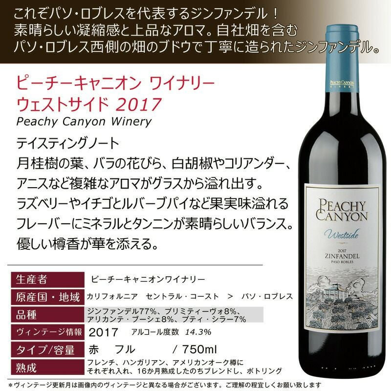 他の画像を見る ★ジンファンデルのスペシャリスト!ピーチー・キャニオン ”ウェストサイド” これぞパソ・ロブレスを代表するジンファンデル!素晴らしい凝縮感と上品なアロマ 重め 辛口 クール便選択可 通常価格 ¥ 4,598 のところ 当店特別価格 ¥ 4,490 税込 在庫切れ カベルネとピノ以外の品種を選ぶカテゴリーでJAL国際線ビジネスクラスにオンリストされたジンファンデル! 詳細を見る お気に入りに登録する