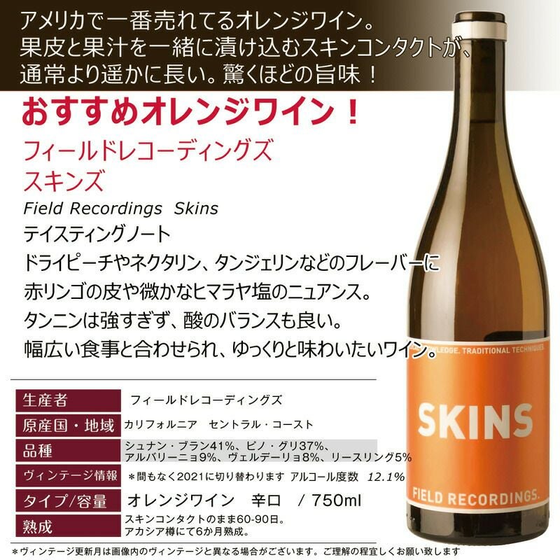 他の画像を見る おすすめオレンジワイン!【セットでお得!オレンジワイン4本セット】アメリカで一番売れてるオレンジワイン フィールドレコーディングズ スキンズ 通常より遥かに長いスキンコンタクトで驚きの旨味! おすすめ 重め 辛口 クール便選択可 通常価格 ¥ 10,852 のところ 当店特別価格 ¥ 10,590 税込 フィールド・レコーディングスのオレンジワインがサンセット・マガジン誌が発表する2018年トップ100ワインにランクイン。スキンコンタクトのまま60-90日。アカシア樽にて6か月熟成 カートに入れる お気に入りに登録する