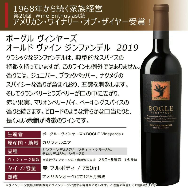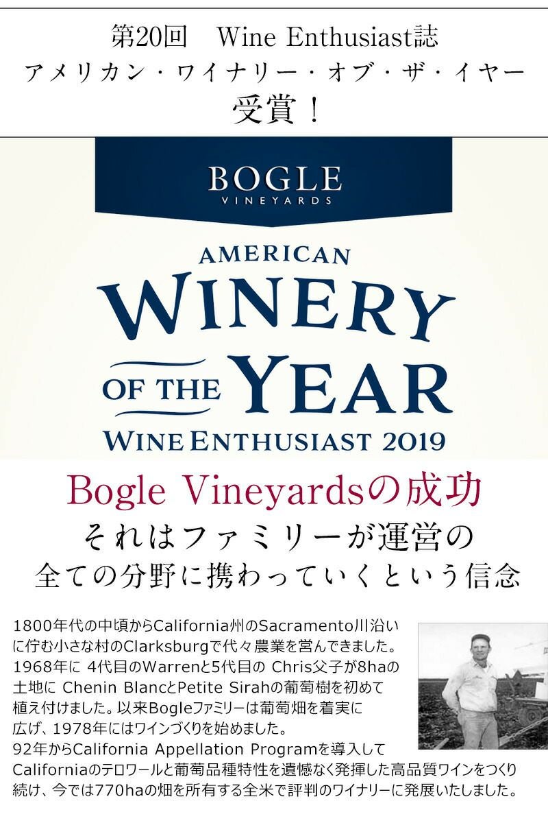 他の画像を見る 【超コスパワインの代名詞Bogle】ボーグルヴィンヤーズ オールドヴァイン ジンファンデル 2018 第20回 Wine Enthusiast誌 アメリカン・ワイナリー・オブ・ザイヤー受賞!【ギフト】 重め 辛口 クール便選択可 通常価格 ¥ 2,627 のところ 当店特別価格 ¥ 2,500 税込 州内の秀逸な葡萄畑から葡萄を調達し、クラークスバーグにあるBogleの自社畑で栽培した葡萄とブレンドをして品種の特性とCA州の葡萄栽培地域のテロワールの素晴らしさを表しています カートに入れる お気に入りに登録する
