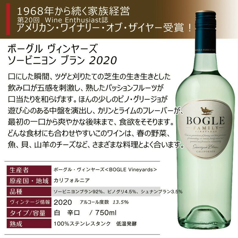 他の画像を見る 【超コスパワインの代名詞Bogle】ボーグルヴィンヤーズ ソービニヨンブラン2020 第20回 Wine Enthusiast誌 アメリカン・ワイナリー・オブ・ザイヤー受賞!【ギフト】 重め 辛口 クール便選択可 通常価格 ¥ 2,442 のところ 当店特別価格 ¥ 2,395 税込 州内の秀逸な葡萄畑から葡萄を調達し、クラークスバーグにあるBogleの自社畑で栽培した葡萄とブレンドをして品種の特性とCA州の葡萄栽培地域のテロワールの素晴らしさを表しています カートに入れる お気に入りに登録する