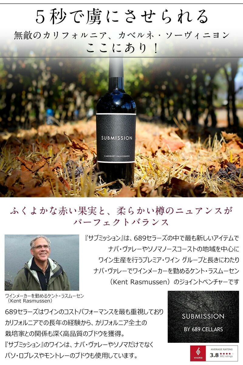 他の画像を見る お得な6本セット★サブミッション【人気の689セラーズ セット割】 赤ワイン 689 サブミッション カベルネ・ソーヴィニヨン カリフォルニア シックスエイトナイン カリフォルニアワイン フルボディ おすすめ 重め 辛口 クール便選択可 当店特別価格 ¥ 14,352 税込 【お得6本セット】無敵のカリフォルニア、カベルネここにあり!ふくよかな果実と柔らかい樽のニュアンスがパーフェクトバランス カートに入れる お気に入りに登録する