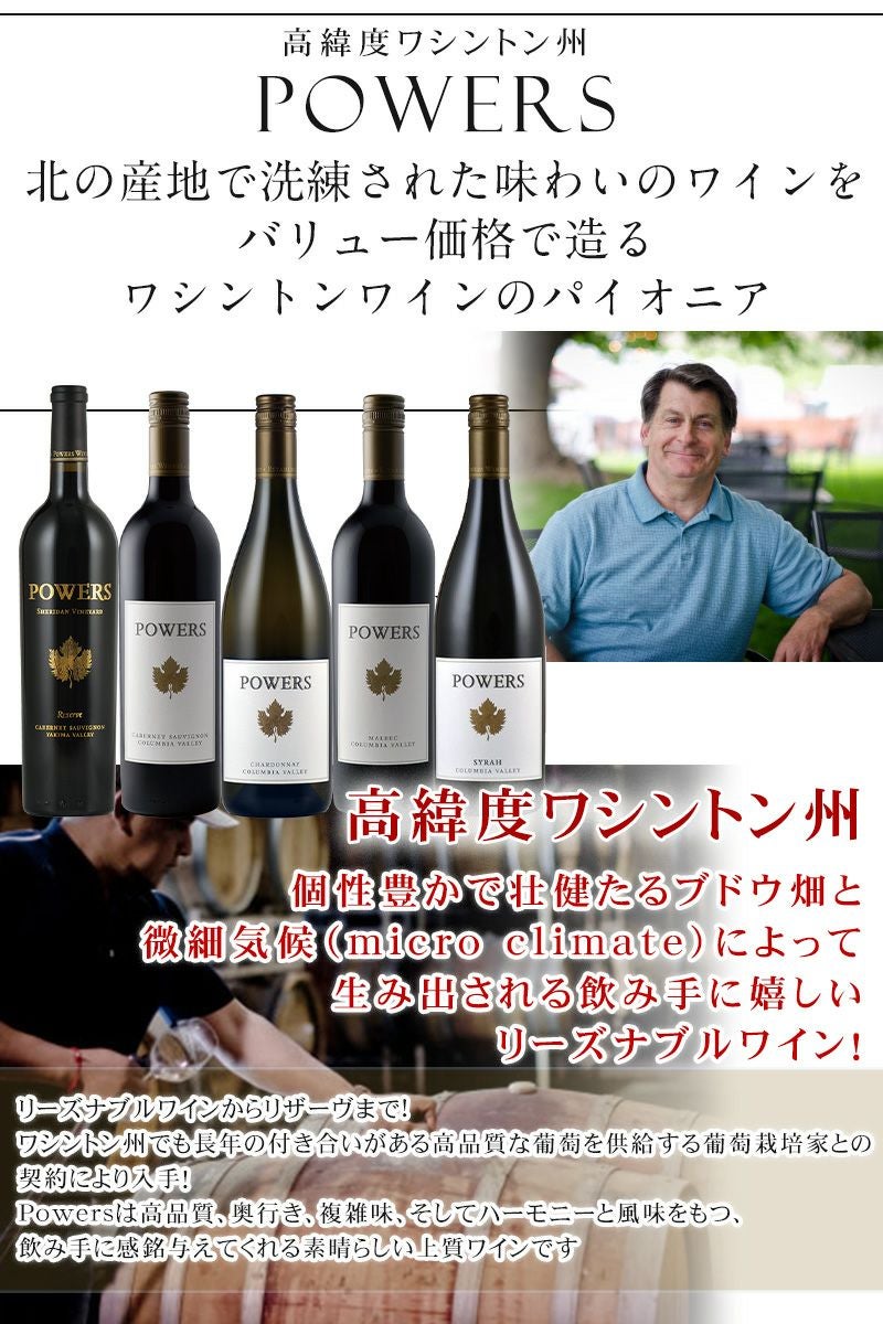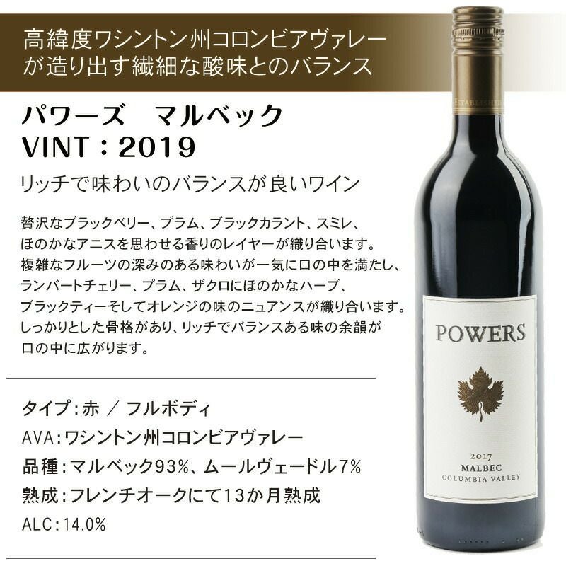 他の画像を見る 赤ワイン フルボディ ワシントン州コロンビアヴァレー 【 Powers パワーズ マルベック ★2019】贅沢なブラックベリー、プラム、ブラックカラント、スミレ、ほのかなアニス 重め 辛口 クール便選択可 通常価格 ¥ 2,580 のところ 当店特別価格 ¥ 2,290 税込 複雑なフルーツの深みのある味わい 絶妙な風味とハーモニーで飲み手の想像を超えるリーズナブルなワイン カートに入れる お気に入りに登録する