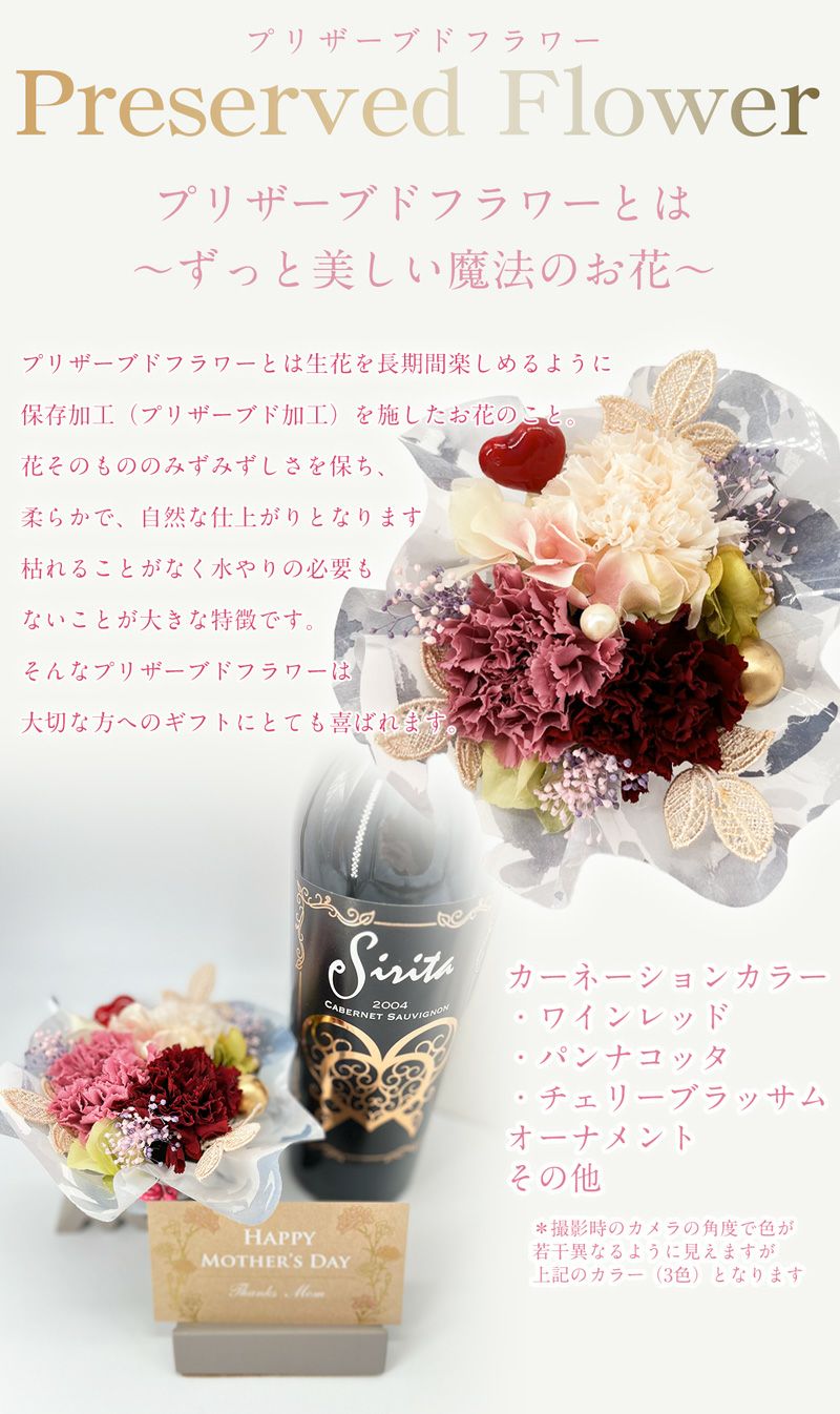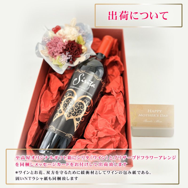 他の画像を見る 【数量限定ギフト!プリザーブドフラワー付き!】【看板商品シリタの母の日ギフトセット】赤ワイン お花 セット★シリタ カベルネ 2005年★カリフォルニアの太陽の下で旨味を凝縮したヴィンテージワイン【古酒オープナー付】 プレゼント New! おすすめ 特別セール 重め 辛口 クール便選択可 通常価格 ¥ 10,902 のところ 当店特別価格 ¥ 9,902 税込 在庫切れ 輸入元だからできるこの価格!独特のレンガ色、スワリングした時のレックス(粘性)、熟成開花したナパのバックヴィンテージワインをご賞味ください! 詳細を見る お気に入りに登録する