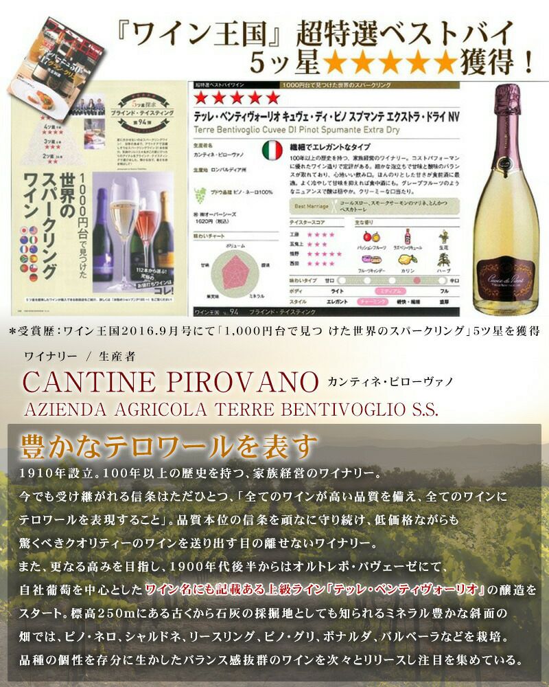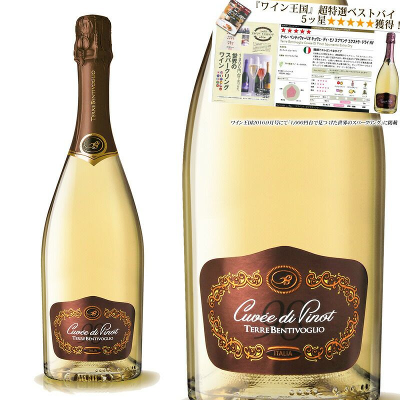 他の画像を見る 【「ワイン王国」超特選ベストバイ5ッ星★★★★★獲得!】イタリアのスプマンテ テッレ・ベンティヴォーリオ キュヴェ・ディ・ピノ スプマンテ エクストラ・ドライ おすすめ 軽め 辛口 クール便選択可 通常価格 ¥ 1,740 のところ 当店特別価格 ¥ 1,690 税込 ピノネロ(黒葡萄)由来のコクのある味わい。泡も繊細できめ細かく、柔らかい味わい。気が付くともうグラスが空になってしまうほど、スイスイと飲めます。 カートに入れる お気に入りに登録する