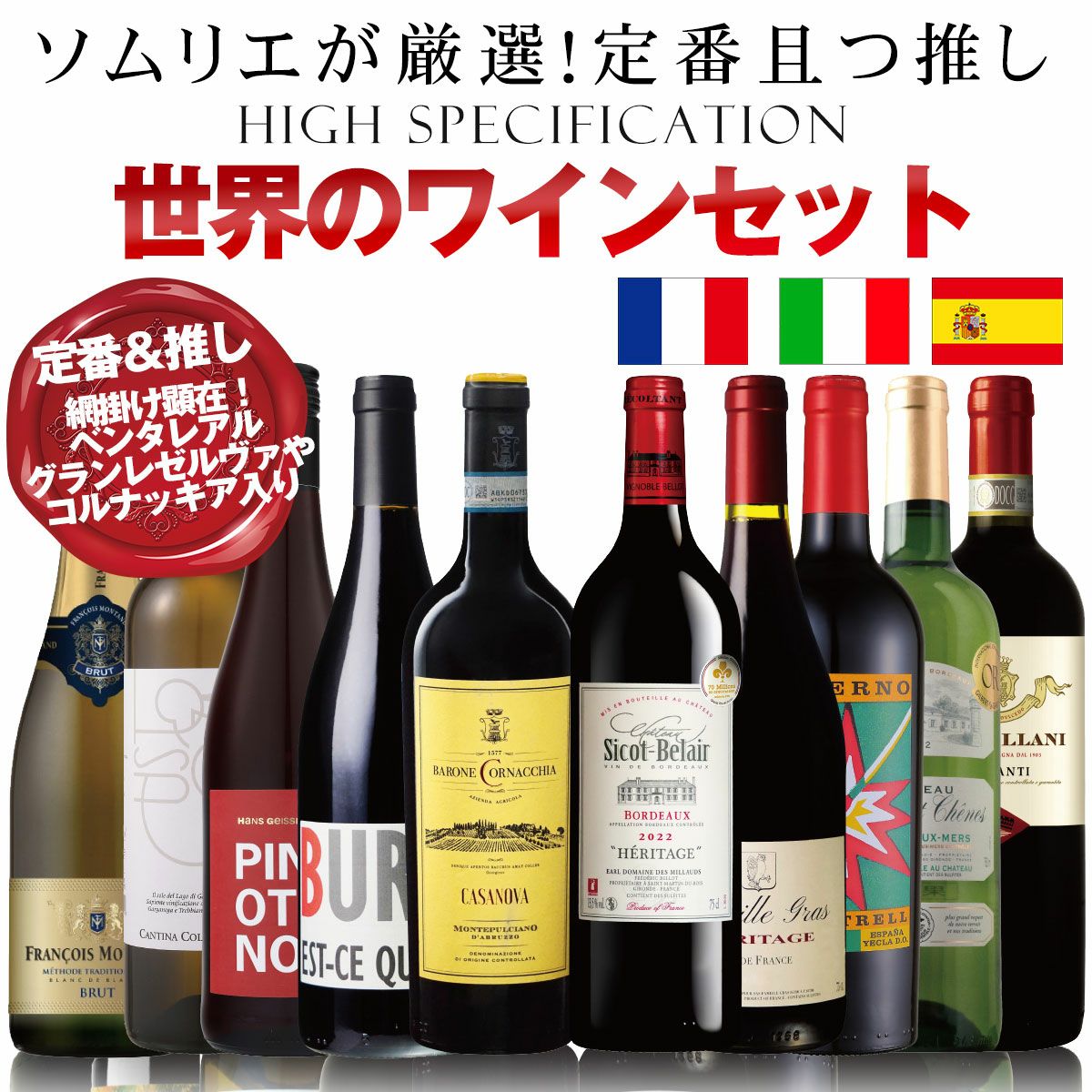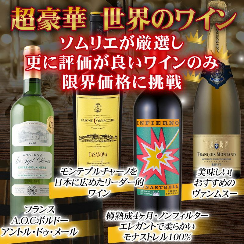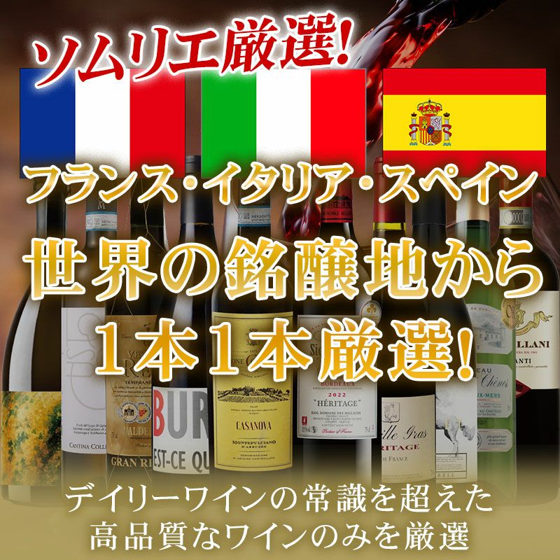 他の画像を見る 【ソムリエコメントあり】[新 世界のワインセット10本 ボルドー、おすすめのブランドブランヴァンムスー、日本にモンテプルチャーノを広めたワイン、ワイン王国高評価品]フランス イタリア スペインEA-W-5 重め 辛口 クール便選択可 通常価格 ¥ 13,980 のところ 当店特別価格 ¥ 13,590 税込 【ランキング2位受賞】ハズレを入れたくない!毎日飲むデイリーワインだからこそ妥協せず拘りました!ボルドー、おすすめのブランドブランヴァンムスー、モンテプルチャーノ、ボルドー、ワイン王国高評価品入り カートに入れる お気に入りに登録する