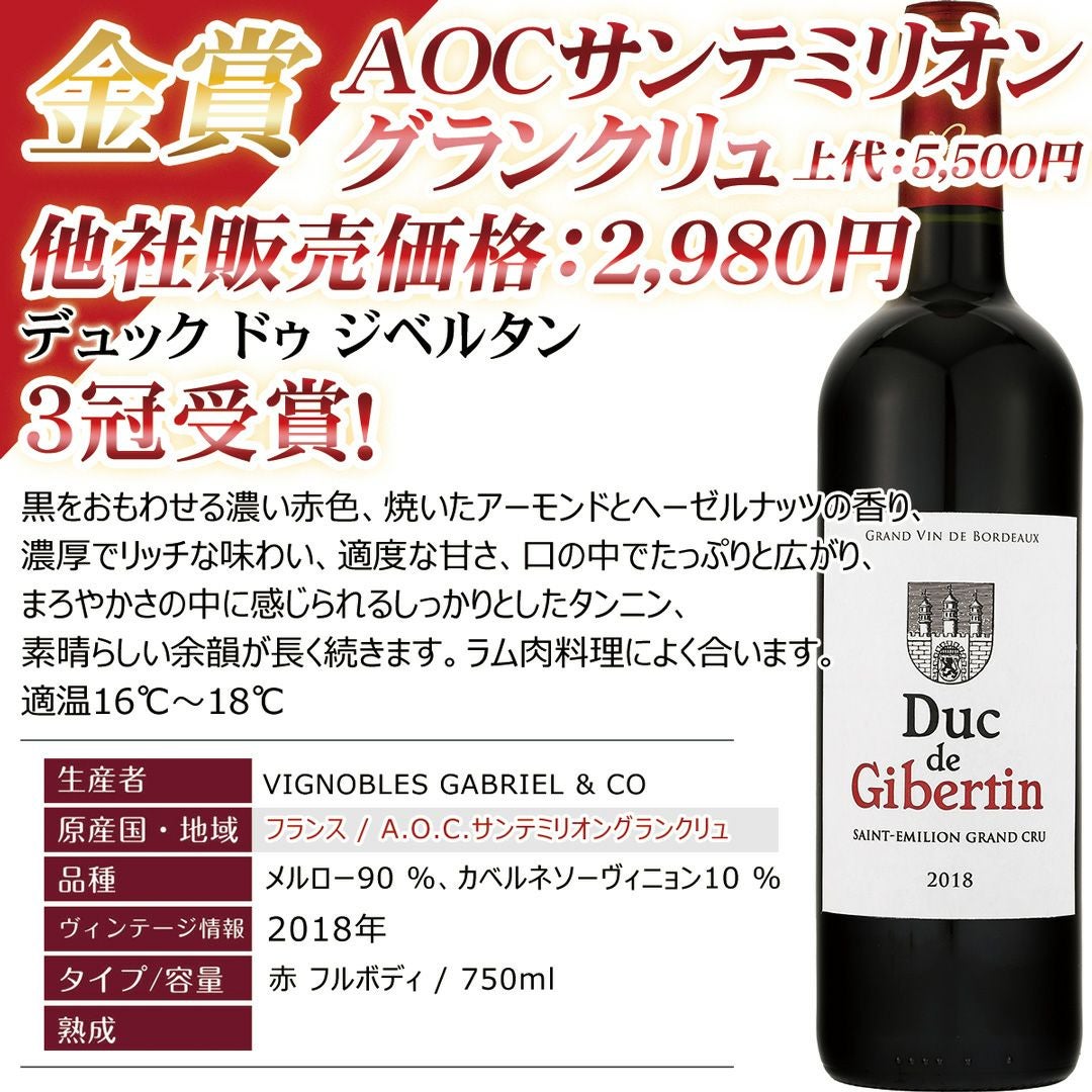 他の画像を見る デイリーワインとしては非常にクォリティ高いボルドー果実味、複雑さ、タンニン、余韻どの項目もこの価格帯では非常にクォリティ高い『フルボディ』ボルドーを厳選! 赤ワイン おすすめ フランス ボルドー サンテミリオン 赤ワイン 【デュック ドゥ ジベルタン】A.O.C.サンテミリオン グランクリュ コスパ◎ New! 重め 辛口 クール便選択可 通常価格 ¥ 2,700 のところ 当店特別価格 ¥ 2,500 税込 カートに入れる お気に入りに登録する