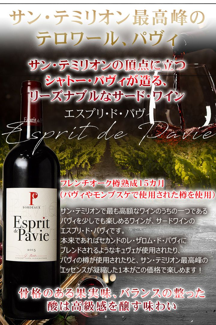 他の画像を見る サン・テミリオンの頂点に立つシャトー・パヴィが造る、リーズナブルなサード・ワイン。骨格のある果実味、バランスの整った酸は高級感を醸す味わいです。 ★パーカーポイント90点 サンテミリオン最高峰のテロワール、エスプリドパヴィ サンテミリオンで最も高額なワインのうちの一つでパヴィを楽しめるサードワイン 熟成15カ月(パヴィやモンブスケで使用された樽を使用) コスパ◎ New! 重め 辛口 クール便選択可 通常価格 ¥ 5,500 のところ 当店特別価格 ¥ 5,400 税込 在庫切れ 詳細を見る お気に入りに登録する