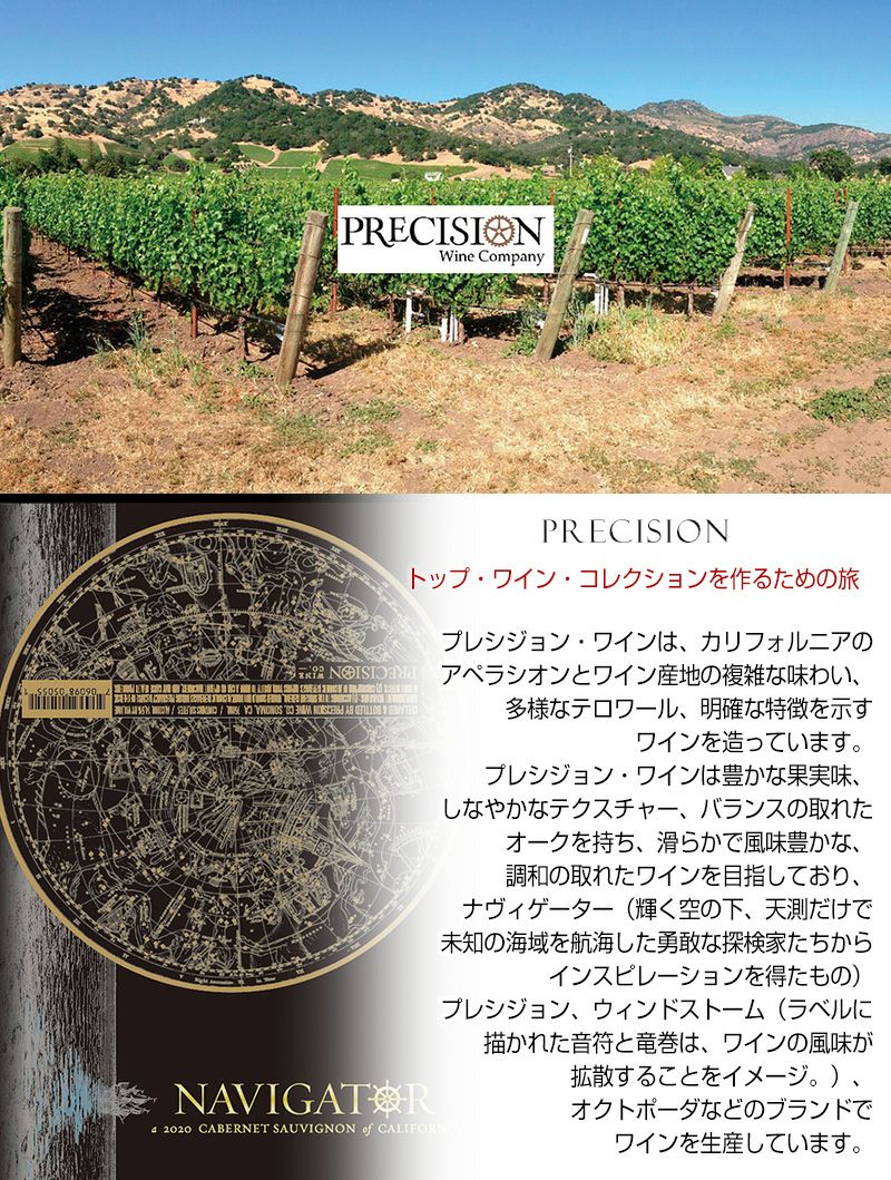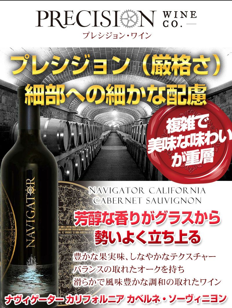 他の画像を見る プレシジョン・ワインは豊かな果実味、しなやかなテクスチャー、バランスの取れたオークを持ち、滑らかで風味豊かな、調和の取れたワイン 新入荷 おすすめ プレシジョン(厳格さ)という名前が示す細部への拘り!【ナヴィゲーター カリフォルニア カベルネ・ソーヴィニヨン 】驚くほど濃密 プレシジョンワインは複雑で美味な味わいが重層している コスパ◎ New! 重め 辛口 クール便選択可 通常価格 ¥ 4,730 のところ 当店特別価格 ¥ 4,690 税込 カートに入れる お気に入りに登録する
