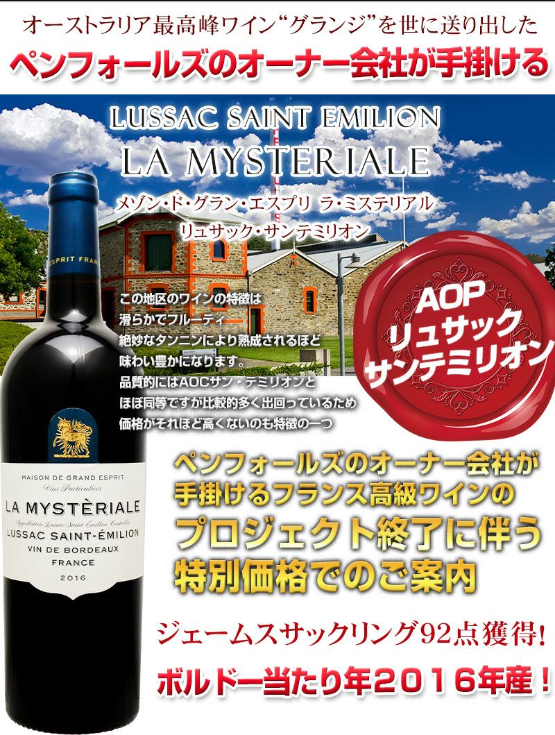 他の画像を見る ペンフォールズとは多くのコレクターを魅了して止まない世界を代表する最高峰のワイン「グランジ」の生産者です メゾン・ド・グラン・エスプリ 【ラ・ミステリアル リュサック・サンテミリオン 2016】 ジェームスサックリング92点獲得!ペンフォールズのオーナー会社が手掛けるフランス高級ワインのプロジェクト終了に伴う特別価格! New! 希少 重め 辛口 クール便選択可 通常価格 ¥ 1,590 のところ 当店特別価格 ¥ 1,590 税込 在庫切れ 詳細を見る お気に入りに登録する