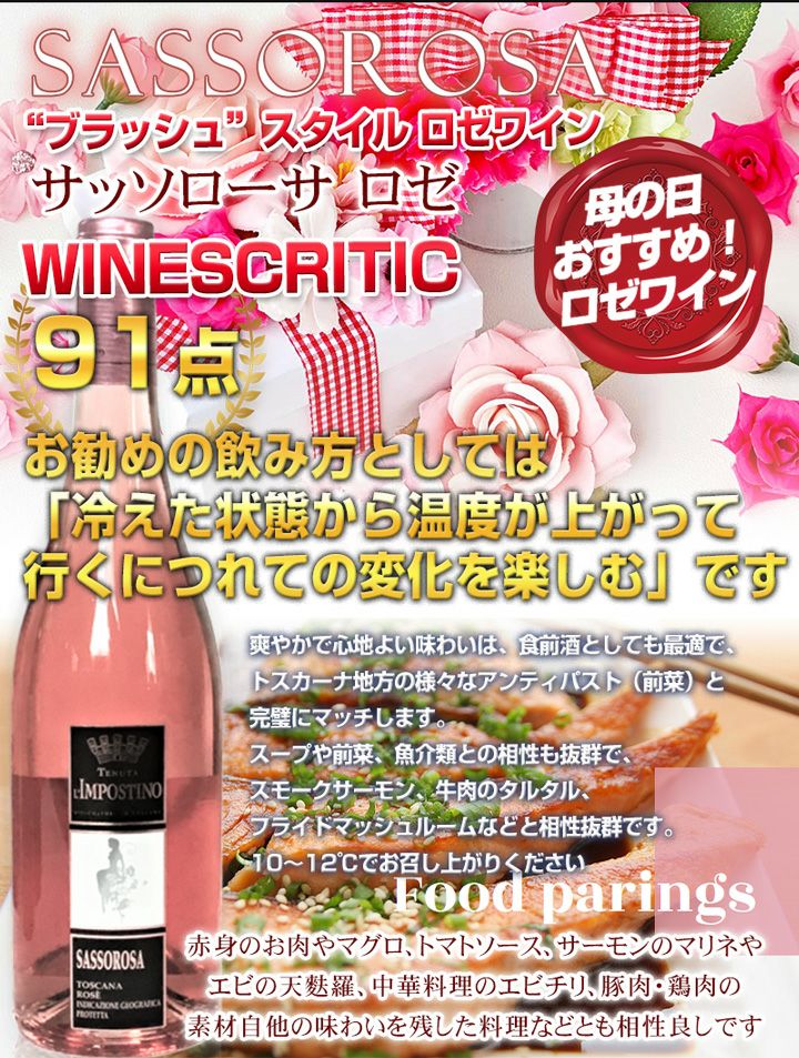 他の画像を見る 『母の日カード付き!』 『母の日カード付き!』イタリア WINESCRITIC 91点!トスカーナ テヌータ インポスティーノ【サッソローザ ロゼ ビオロジコ】淡いピンク色をした『ブラッシュ』スタイルのワイン New! 特別セール 軽め 辛口 クール便選択可 通常価格 ¥ 4,980 のところ 当店特別価格 ¥ 4,700 税込 カートに入れる お気に入りに登録する