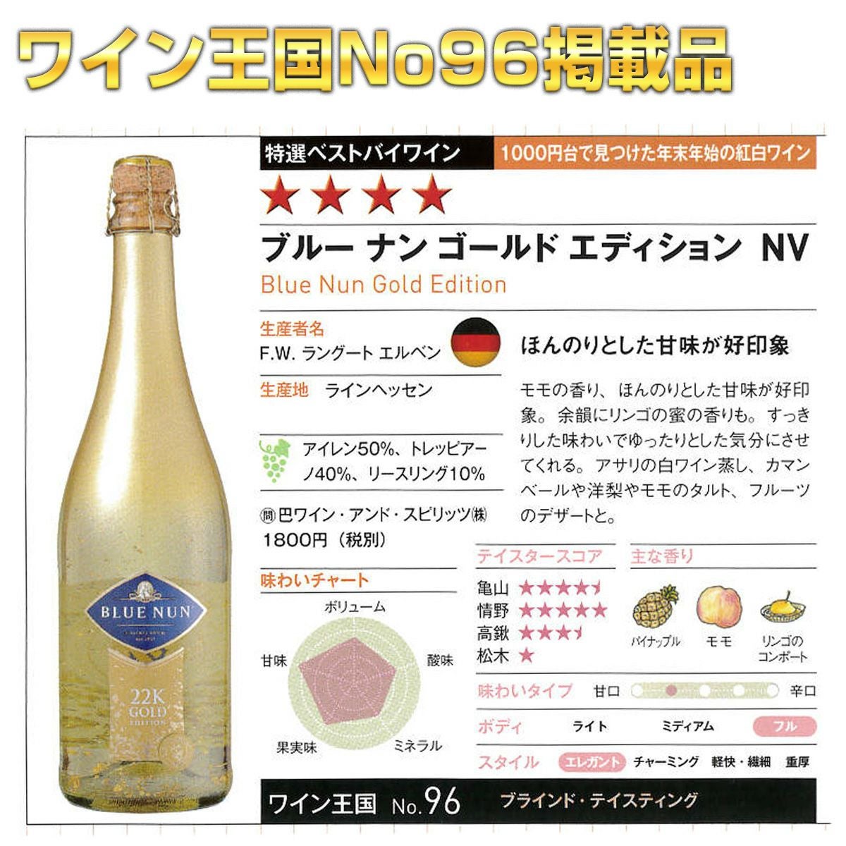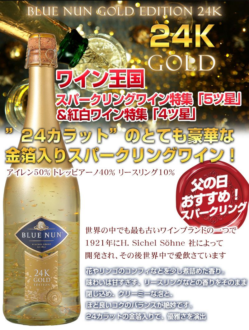 他の画像を見る 金箔入りスパークリングワイン! 24カラットのとても豪華な金箔入りスパークリングワイン! ギフト 【ブルーナン ゴールド エデイション】 雑誌ワイン王国No96掲載品 『4ッ星★★★★』 軽め 甘口 クール便選択可 通常価格 ¥ 4,980 のところ 当店特別価格 ¥ 4,490 税込 カートに入れる お気に入りに登録する
