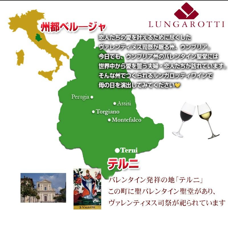 他の画像を見る 家庭料理にも高級料理にもぴったりのワインです。1968年からDOCワインとして認定されており、ルンガロッティワインの中で最も多く輸出されている人気ワイン ルンガロッティワインで乾杯した家族の愛は永遠に!聖バレンタインが眠る州 「ウンブリア」愛を感じるワイン 【ルンガロッティ ルベスコ ロッソ・ディ・トルジャーノ375ml(ハーフボトル)】母の日 ギフト 贈り物 ギフト箱付き New! 重め 辛口 クール便選択可 当店特別価格 ¥ 3,300 税込 カートに入れる お気に入りに登録する