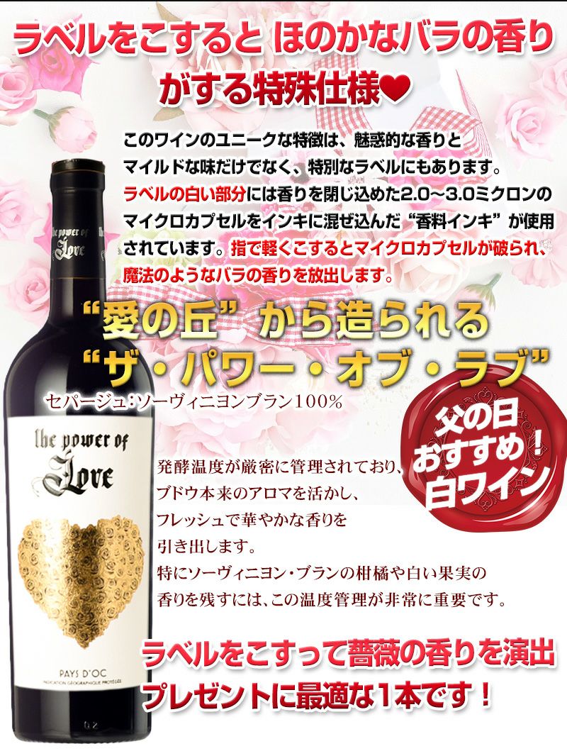 他の画像を見る ラベルには香りを閉じ込めた2.0~3.0ミクロンのマイクロカプセルをインキに混ぜ込んだ“香料インキ”を使用。指で軽くこすると魔法のようなバラの香りを放出します!! おすすめ ラベルを擦るとほのかなバラの香り “Collines de l'Amour”(愛の丘)と呼ばれる場所で収穫されたワイン!このワインのユニークな特徴は、魅惑的な香りとマイルドな味だけでなく、特別なラベルにも!白ワイン ザ・パワー・オブ・ラブ 重め 辛口 クール便選択可 当店特別価格 ¥ 3,980 税込 〜 当店特別価格 ¥ 税込 詳細を見る お気に入りに登録する